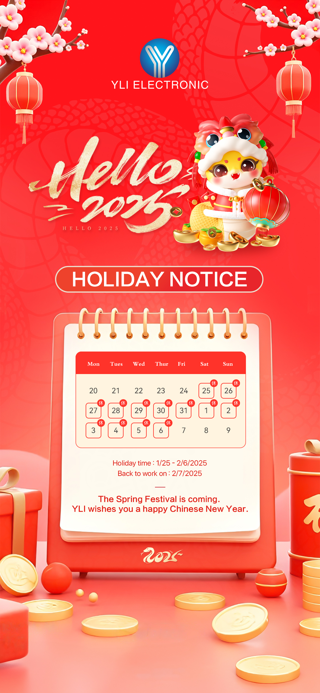 We hereby inform you that our company and factory will be on Chinese New Year holiday