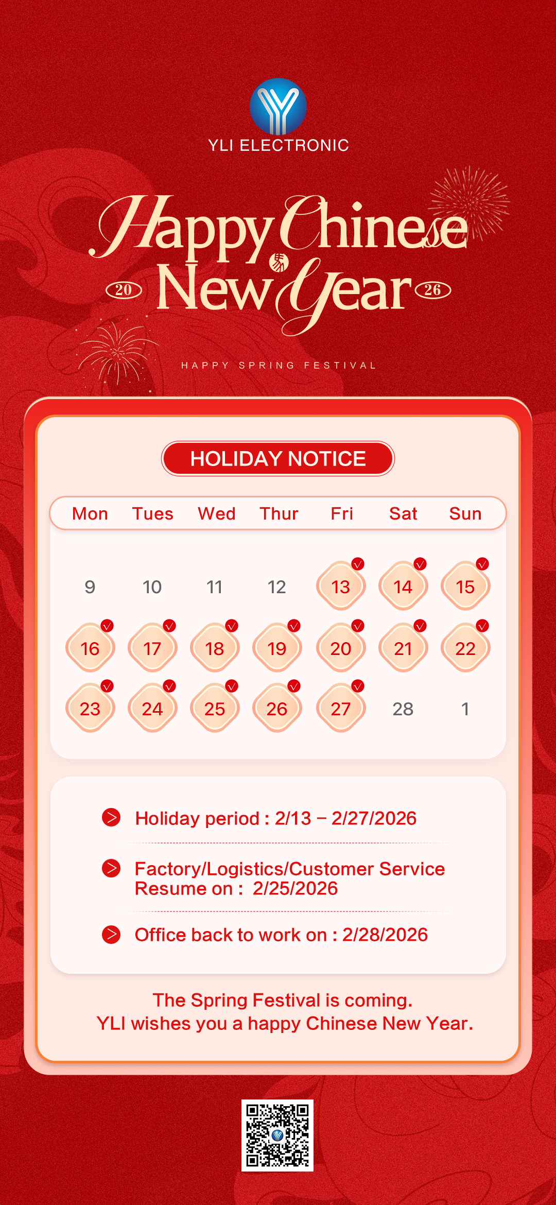 The holiday is adjusted to a 15-day break, and work will officially resume on February 28, 2026 (the 12th day of the first lunar month).