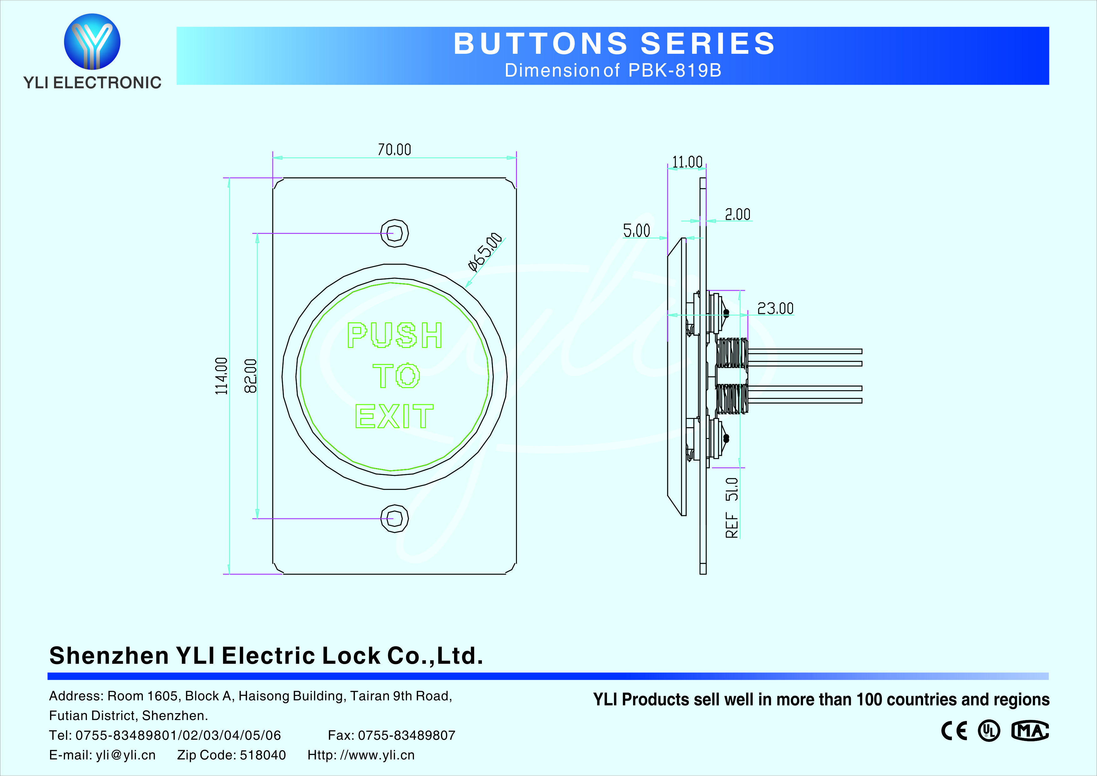PBK-819B is a door release button with stainless steel palte with size of 114Lx70Wx30.8H(mm), which can be match use with back box.