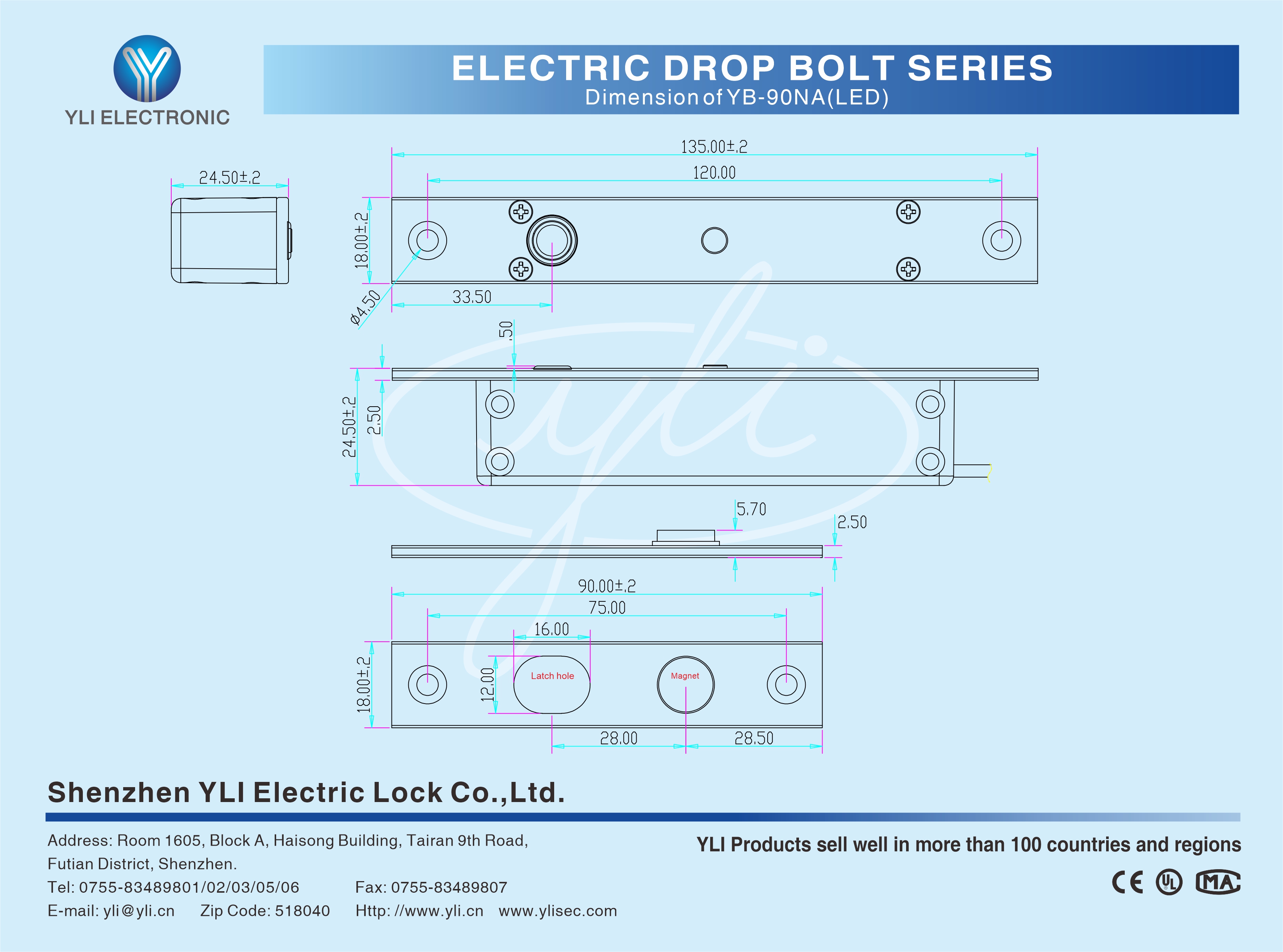 YB-90NA(LED) is an Mini Electric Bolt,which is manufactured by 304 type of stainless steel with special design.The linkage,manufactured by lathe,can withstand 500kg holding force.The special design of all-metal linkage parts results it can bear with the temperature of 60 ℃ or?-30 ℃ below zero,it pass through security test after it has been used for over 1 million times