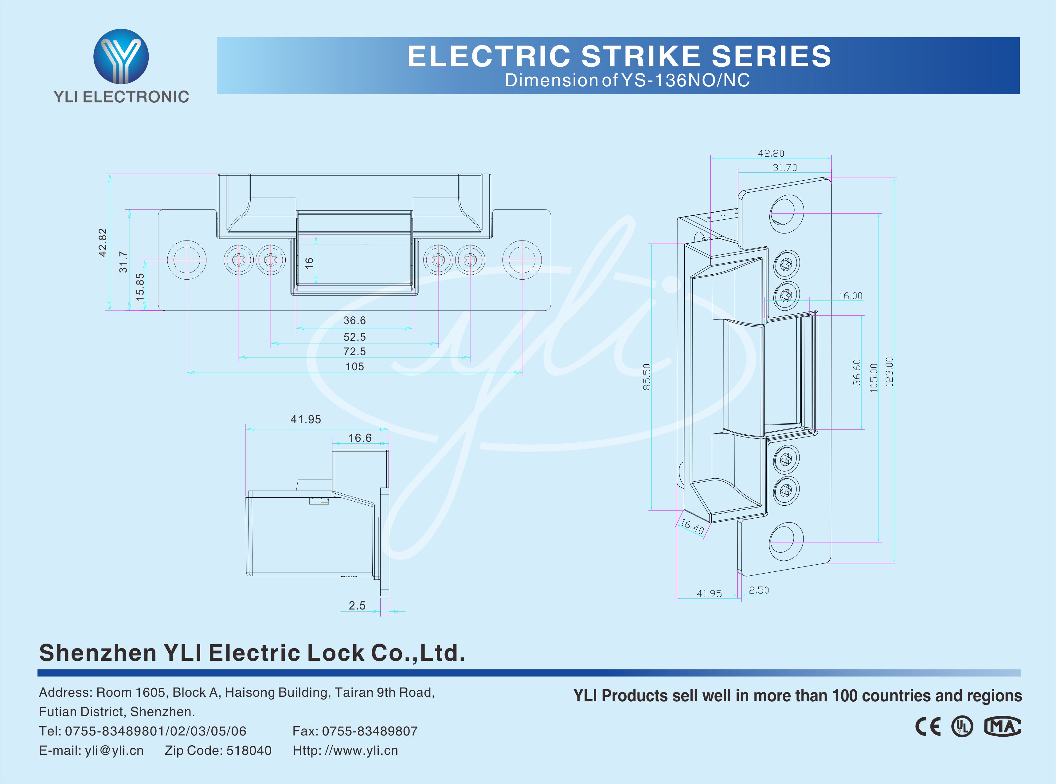 YS-136NO/NC-IP is an American standard heavy duty waterproof electric strike. This is suitable for many different doors. The operating principle of electric strike is that electromagnetism produces the force to pull or push the release lever so that to lock or open the door.