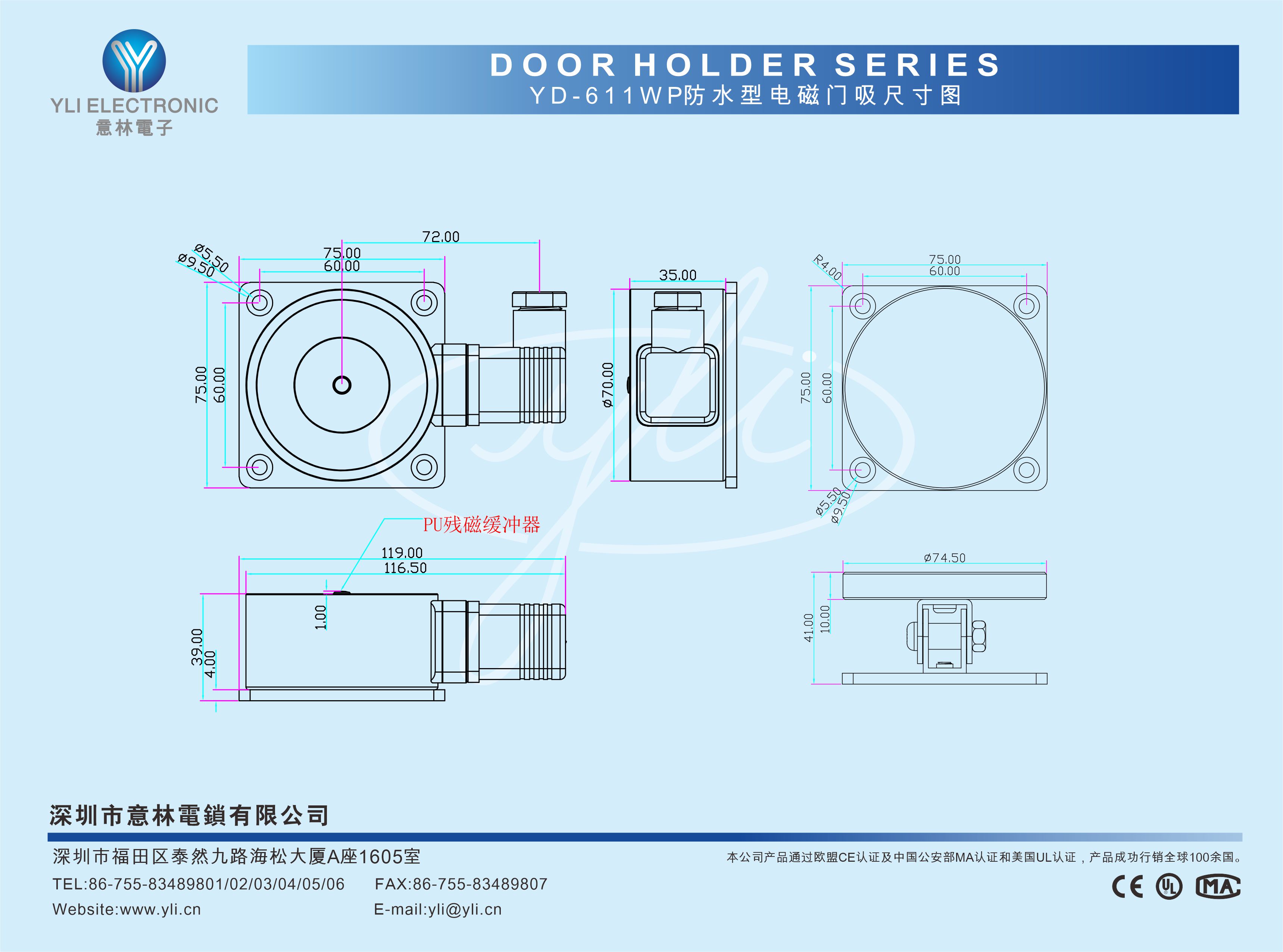 YD-611WP is a wall mount waterproof electromagnetic door holder with a waterproof grade of IP65 and holding force is150kg. The surface treatment adopts the world's top electroplating process and has passed the 500 hours salt spray test of the National Laboratory. It is widely used in outdoor building facilities, ships, nuclear power plants, port , coastal intelligent buildings, open air and humid environments .Special anti-residual magnetism design, more safe and durable