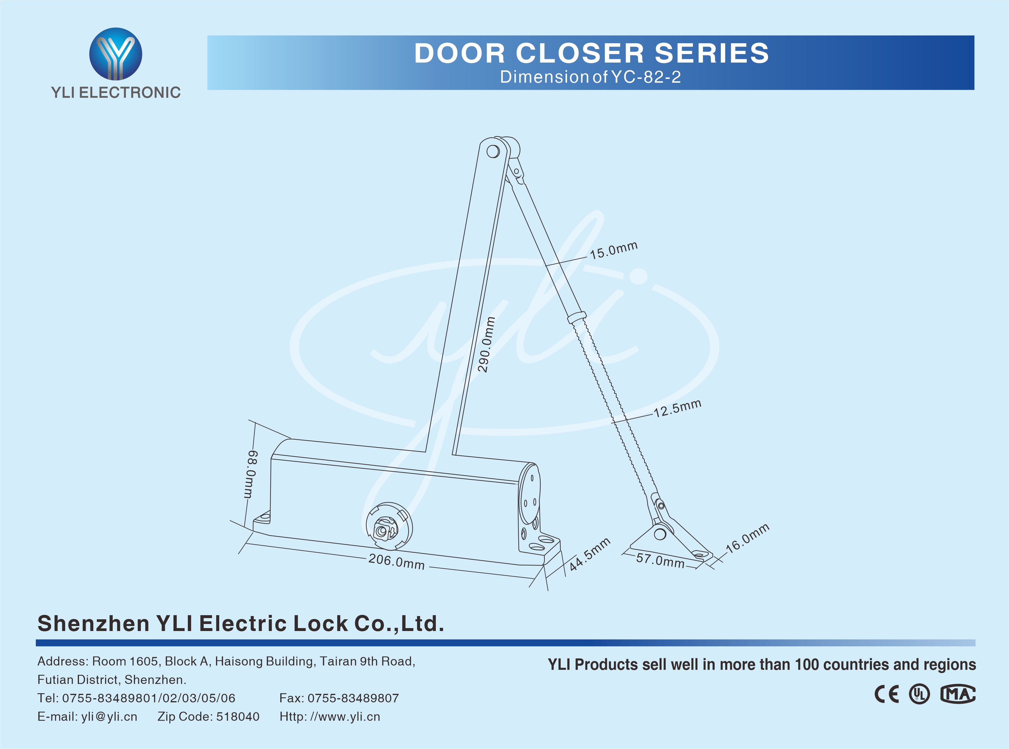 Door closer is installed at the top of the door leaf with single opening, is applicable to wooden door、steel door and fire door.