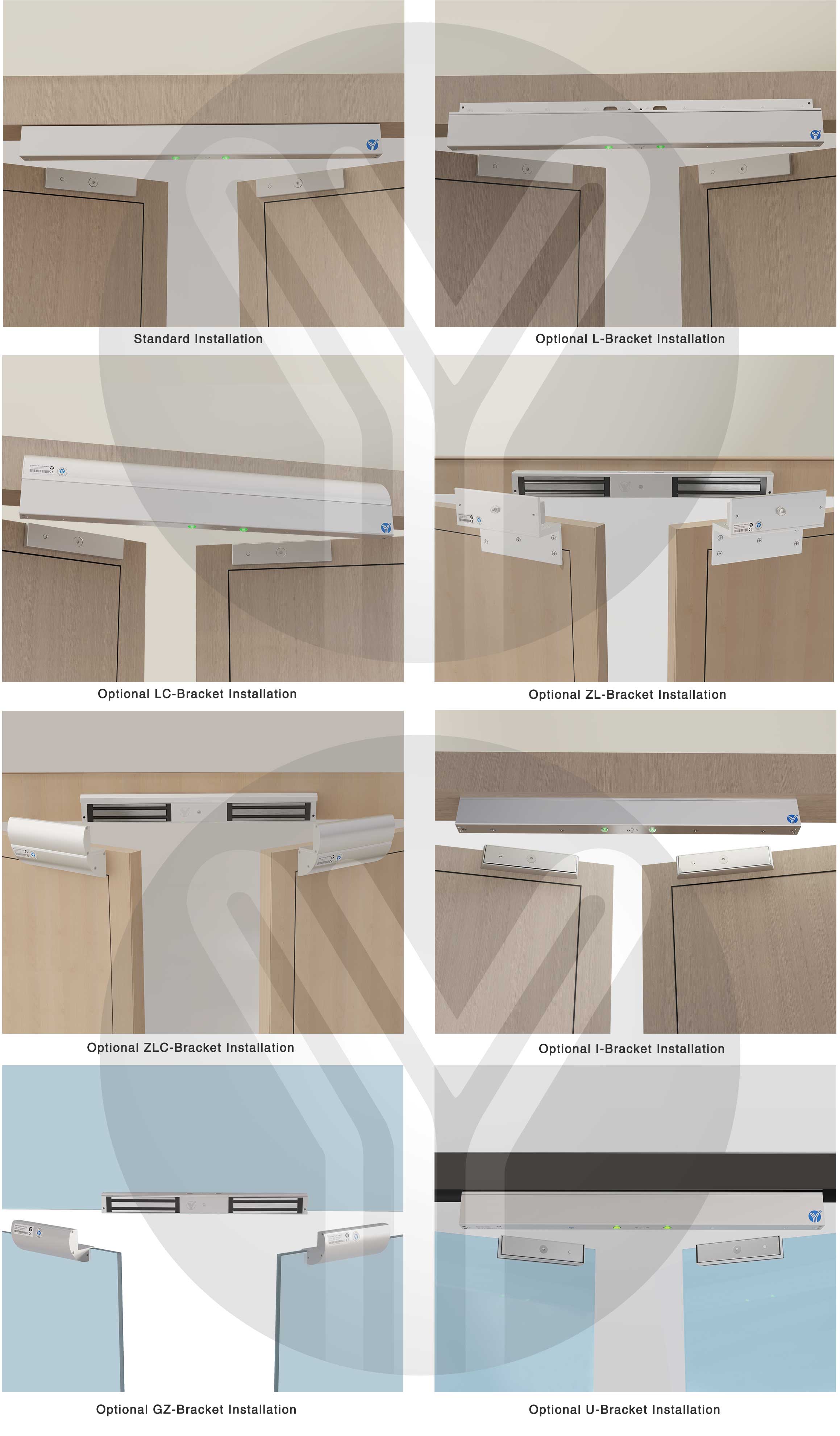 YM-180ND(LED) Double door magnetic lock is designed for wooden door, metal door, glass door and fireproof door. There is a set of lock status signal (NO/NC/COM) output contacts. The lock body is equipped with a large LED light . The green light indicates unlocking , and the red light indicates locking. YLl magnetic lock cores are produced with robotic laser welding technology, providing 2 to 3 times stronger impact resistance and torsional resistance than conventional production processes. The surface is treated with the internationally leading electroplating process and the lock itself has passed the 240-hour salt spray test in the national laboratory, achieving excellent performance of anti-oxidation, anti-rust and anti-corrosion. Our company offers a complete range of brackets for different locks.