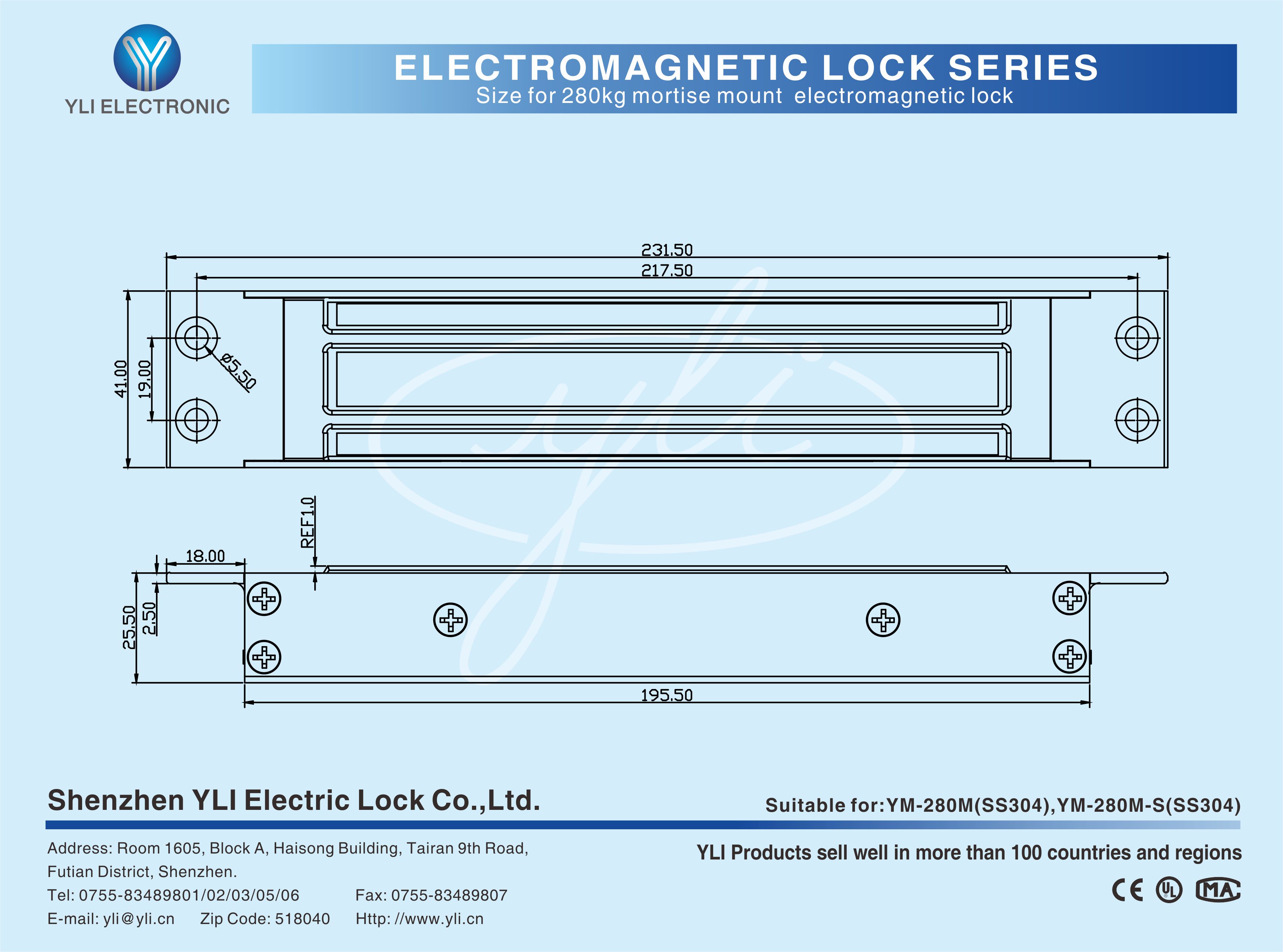 YM-280M(SS304)/M-280M-S(SS304) Single door mortice magnetic lock is designed for wooden door, metal door, glass door, fire-proof door. The shell and installation structural parts are made of 304 stainless steel to prevent the deformation or fracture when the door is opened and closed forcefully. There is a set of lock status signal (NO/NC/COM) output contacts, which provides real-time feedback for the access control system. YLl magnetic lock cores are produced with robotic laser welding technology, providing 2 to 3 times stronger impact resistance and torsional resistance than conventional production processes. The surface is treated with the internationally leading electroplating process and the lock itself has passed the 240-hour salt spray test in the national laboratory, achieving excellent performance of anti.oxidation, anti-rust and anti-corrosion. Our company offers a complete range of brackets for different locks.