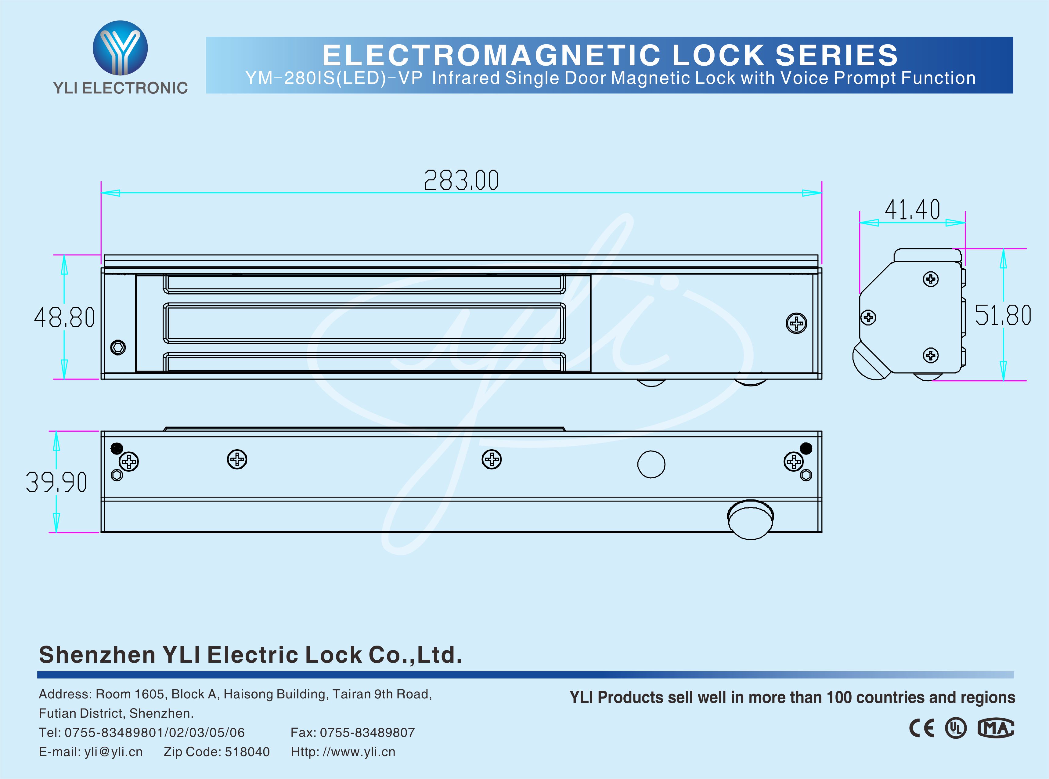 YM-2801S(LED)-VP Single door magnetic lock is designed for wooden door, metal door, glass door and fireproof door. lt is equipped with dual functions of infrared sensor automatic unlocking and voice prompt. When the infrared sensor detects people, it will issue a voice prompt of "The door is open" and unlock. The infrared sensing distance is 3 meters and it is wide-angle with 130 degrees. The lock has an adjustable time delay function of 0/3/6/9 seconds. There is a set of lock status signal (NO/NC/COM) output contacts. The lock body is equipped with a large LED light. The green light indicates unlocking, and the red light indicates locking. YLl magnetic lock cores are produced with robotic laser welding technology, providing 2 to 3 times stronger impact resistance and torsional resistance than conventional production processes. The surface is treated with the internationally leading electroplating process and the lock itself has passed the 240-hour salt spray test in the national laboratory, achieving excellent performance of anti-oxidation, anti-rust and anti-corrosion. Our company offers a complete range of brackets for different locks.