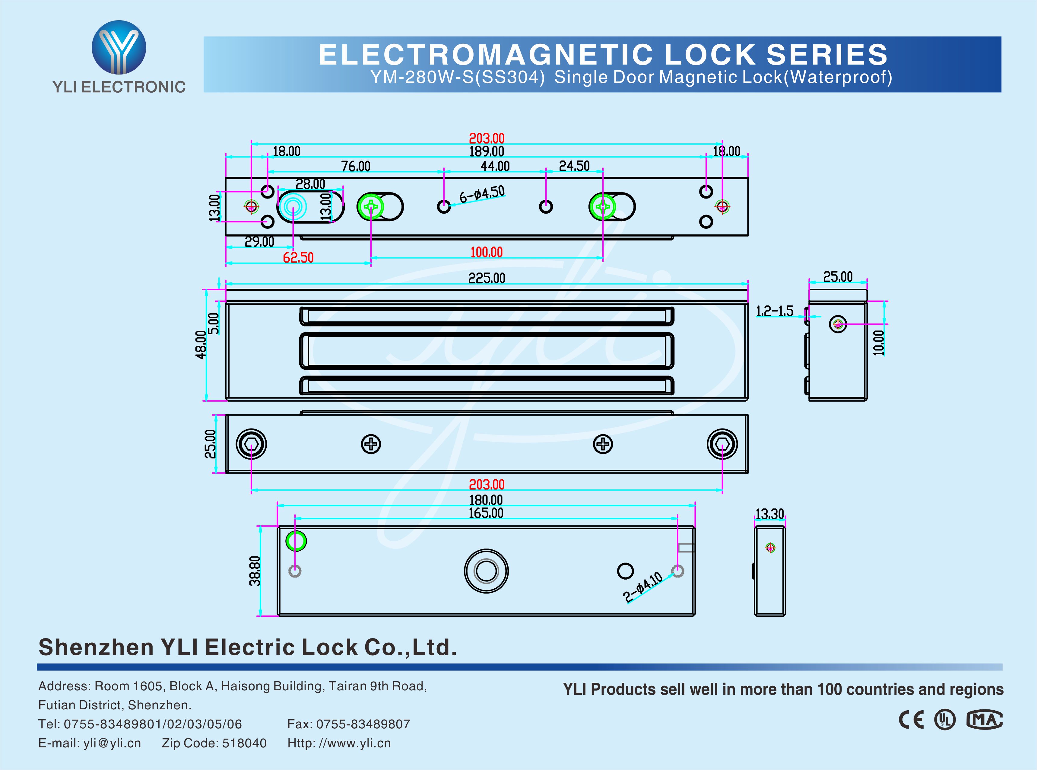 YM-280W-S(SS304) The waterproof single-door magnetic lock with signal output is designed for metal doors, wooden doors, fireproof doors, glass doors, it's IP-68 rated, can be used outdoors and environment with high humidity and high salinity. The shell and mounting plate are made of 304 stainless steel. Anti-drop steel cables are provided on both sides of the lock body. There is a set of lock status signal (NO/COM) output contacts. YLl magnetic lock cores are produced with robotic laser welding technology, providing 2 to 3 times stronger impact resistance and torsional resistance than conventional production processes. The surface is treated with the internationally leading electroplating process and the lock itself has passed the 240-hour salt spray test in the national laboratory, achieving excellent performance of anti-oxidation, anti-rust and anti-corrosion. Our company offers a complete range of brackets for different locks.