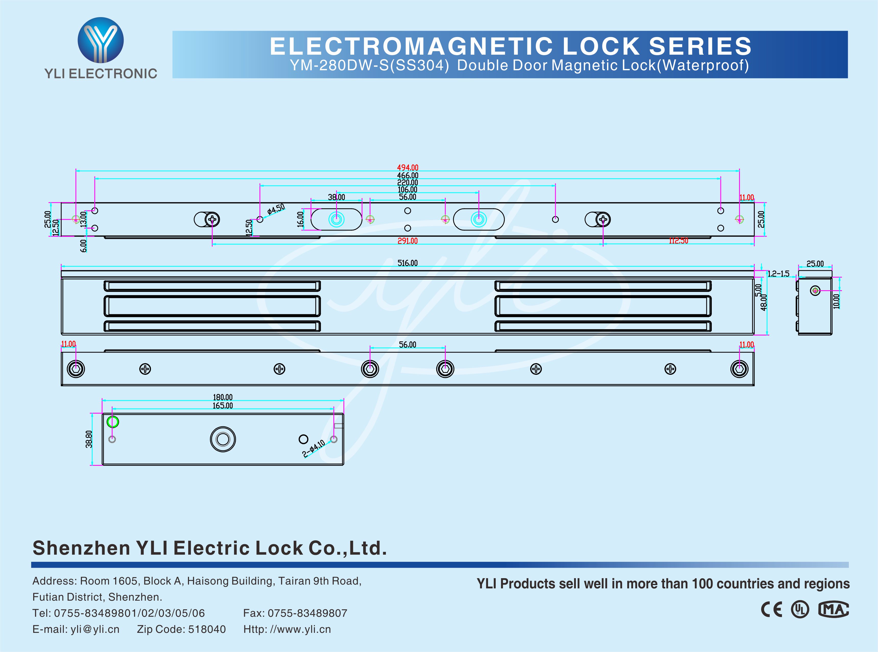 YM-280DW-S(SS304) Waterproof double magnetic lock with signal output is designed for metal doors, wooden doors, fireproof doors, glass doors, it's IP-68 rated.can be used outdoors and environment with high humidity and high salinity. The shell and mounting plate are made of 304 stainless steel. There is a set of lock status signal (NO/COM) output contacts. The lock body is equipped with a large LED light. The green light indicates unlocking , and the red light indicates locking.YLl magnetic lock cores are produced with robotic laser welding technology, providing 2 to 3 times stronger impact resistance and torsional resistance than conventional production processes. The surface is treated with the internationally leading electroplating process and the lock itself has passed the 240-hour salt spray test in the national laboratory, achieving excellent performance of anti-oxidation, anti-rust and anti-corrosion.Our company offers a complete range of brackets for different locks.