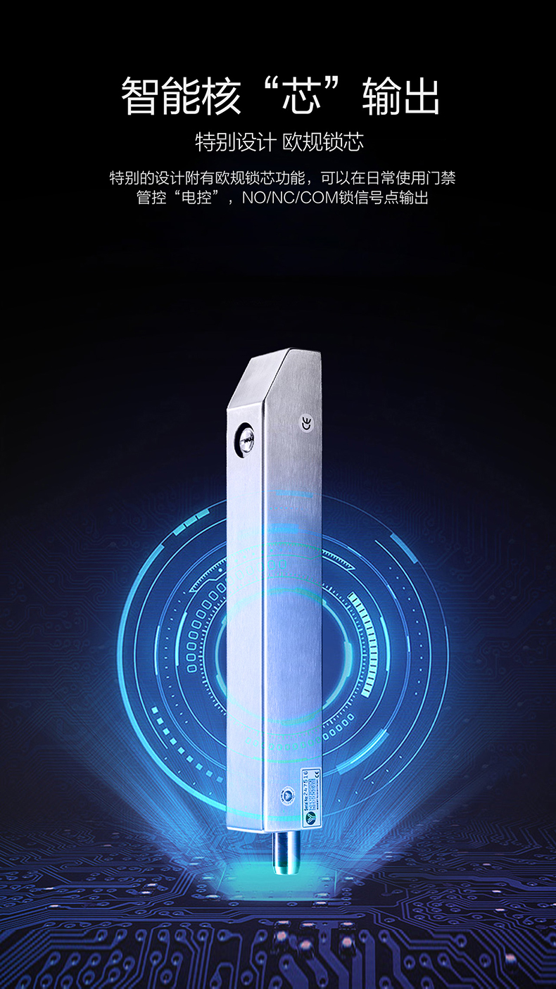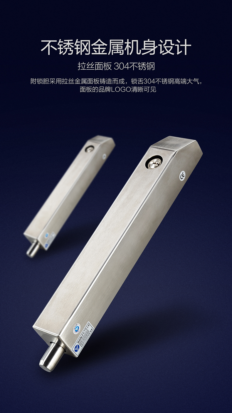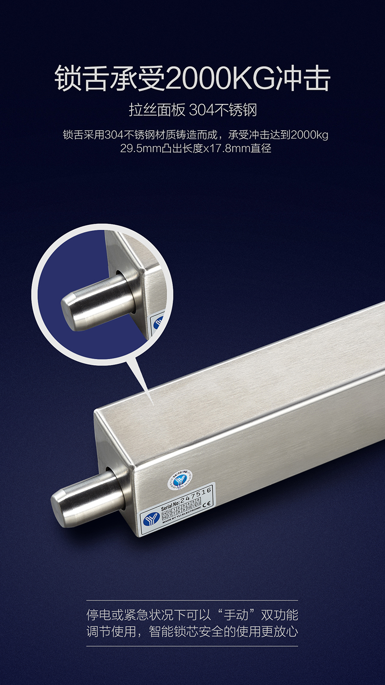 ,配有歐規(guī)鎖芯,附鎖匙功能,可以達(dá)到平時“電控”與緊急時“手動”雙用的目的。鎖舌采用整體式304不銹鋼實芯棒材,經(jīng)CNC車床精工而成,可承受2000kg沖擊,