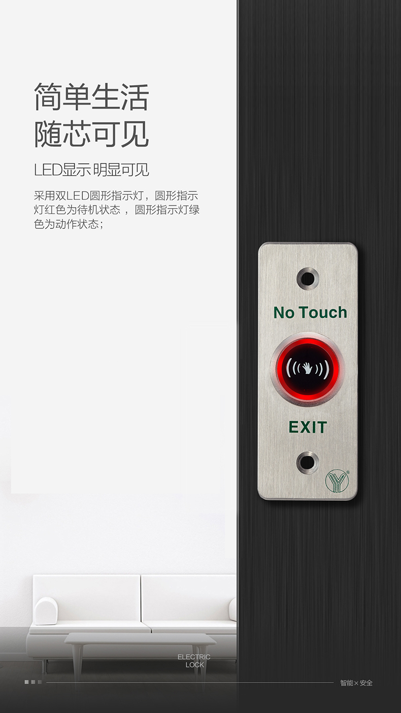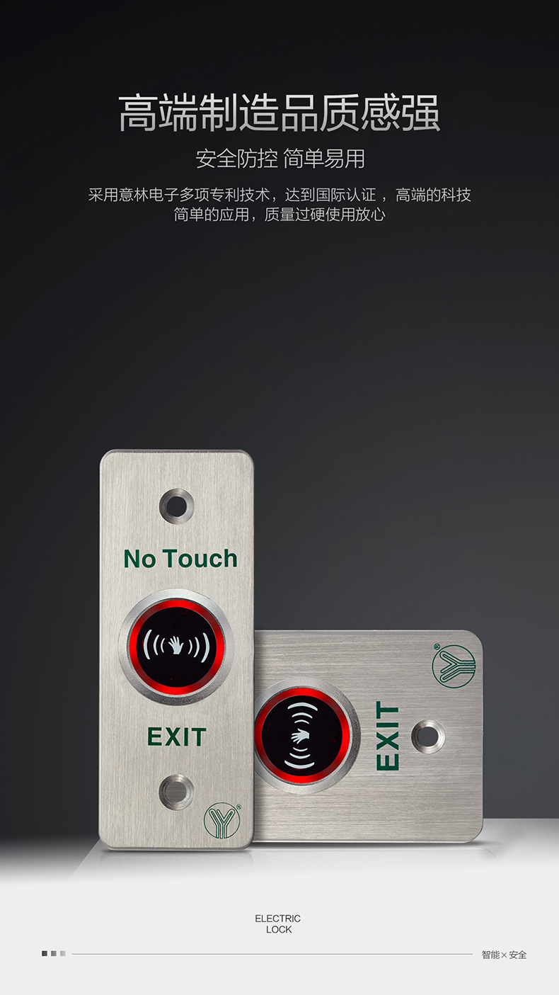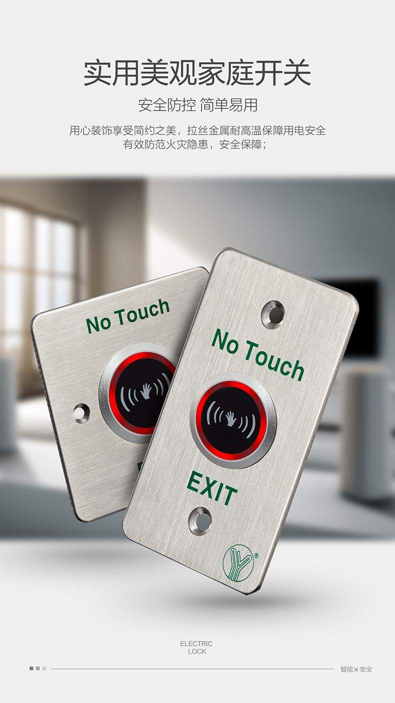 是門禁系統中最常見以及最常被使用到的,出門開關通常用于一般公家機關、銀行、大型、中小型企業以及百貨公司和住宅,外出開關系列有紅外線、觸控式、按鈕式、外出推把等。