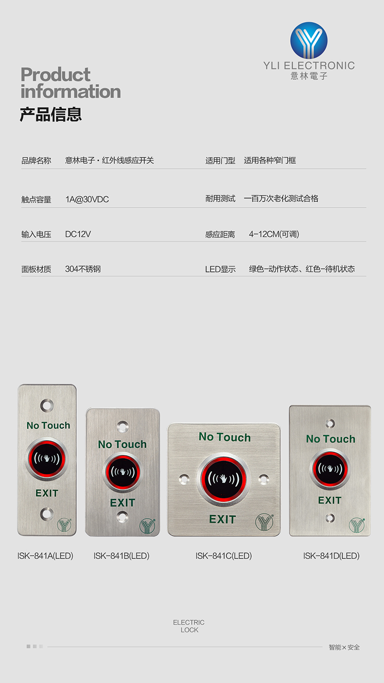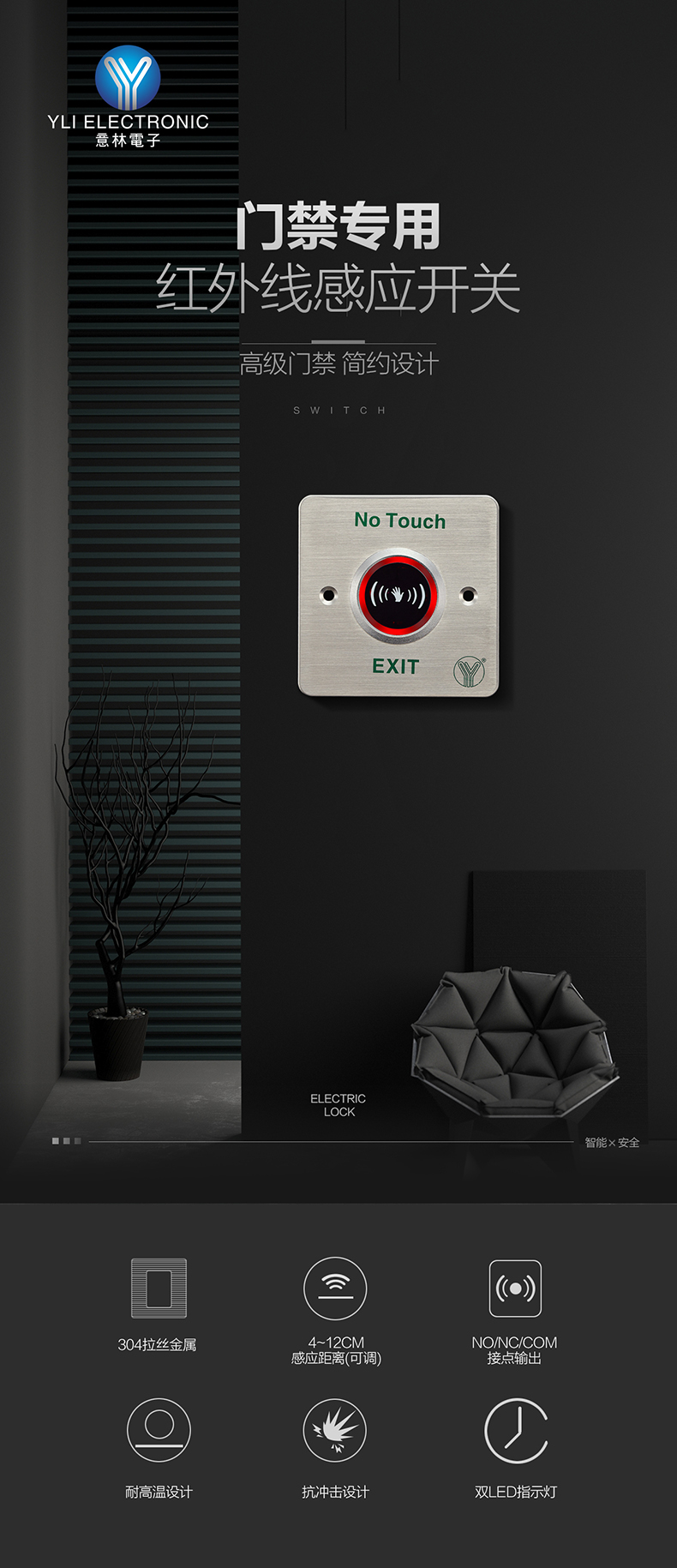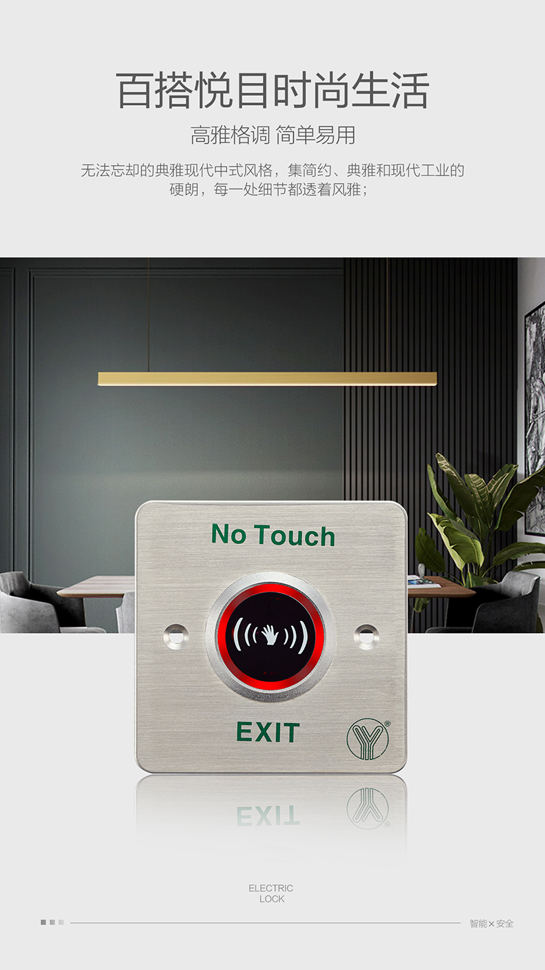 是門禁系統中最常見以及最常被使用到的,出門開關通常用于一般公家機關、銀行、大型、中小型企業以及百貨公司和住宅,外出開關系列有紅外線、觸控式、按鈕式、外出推把等。