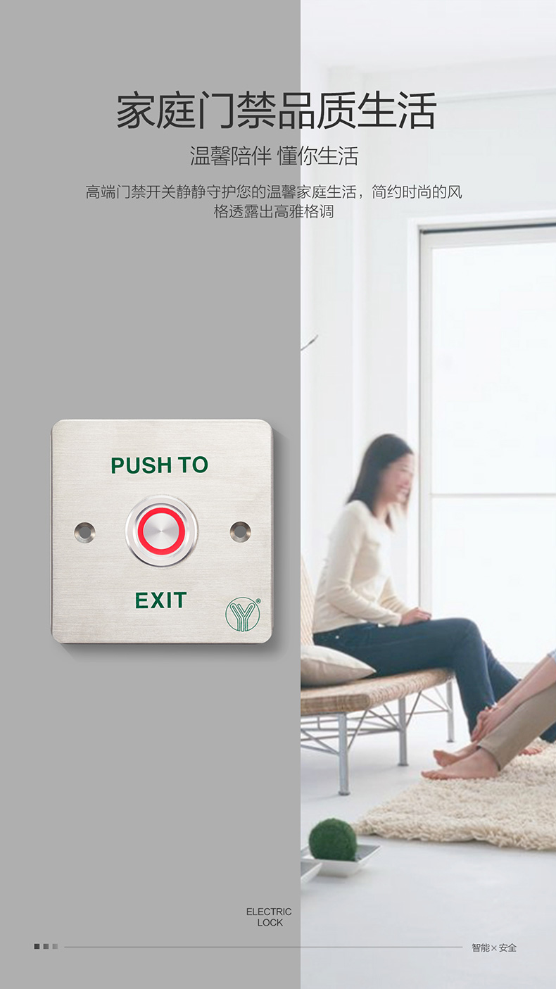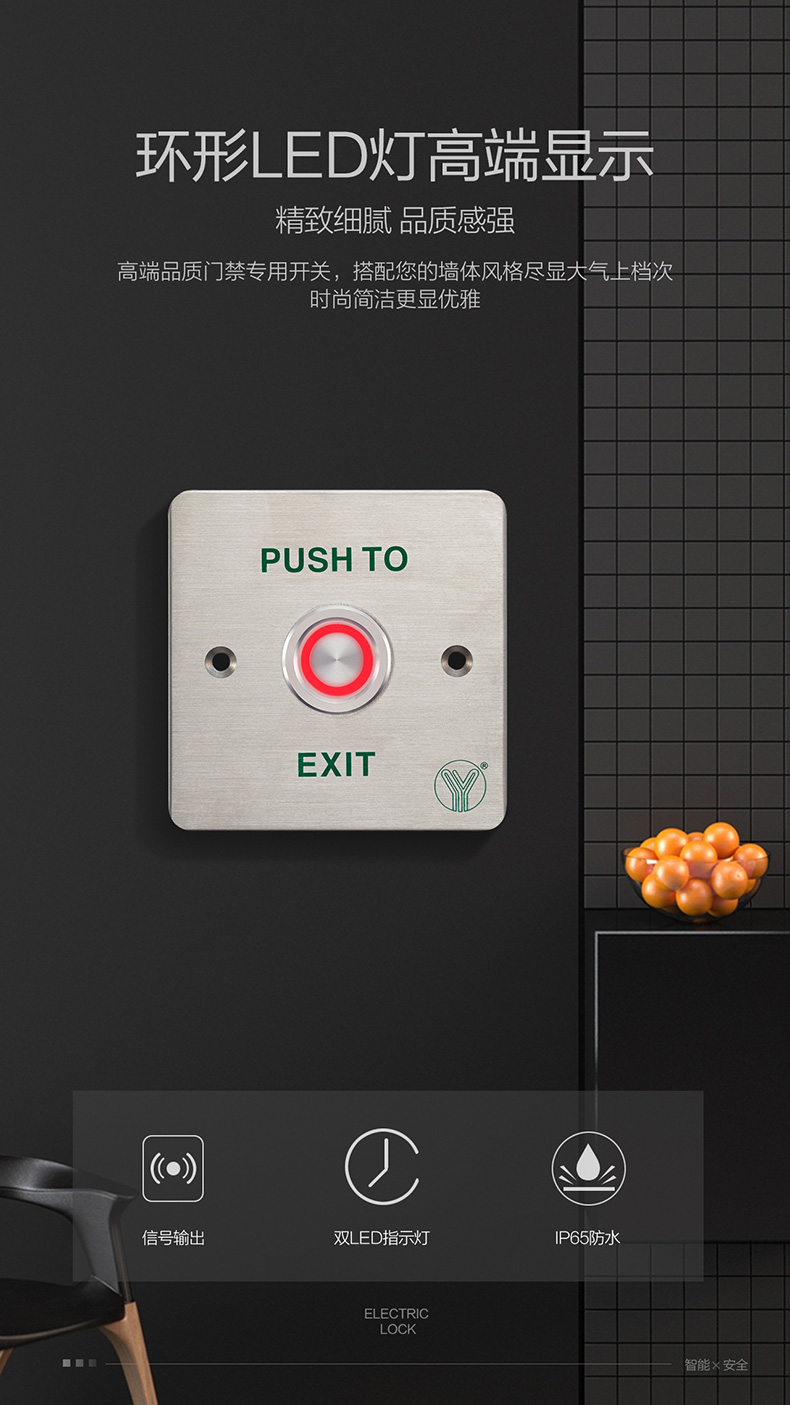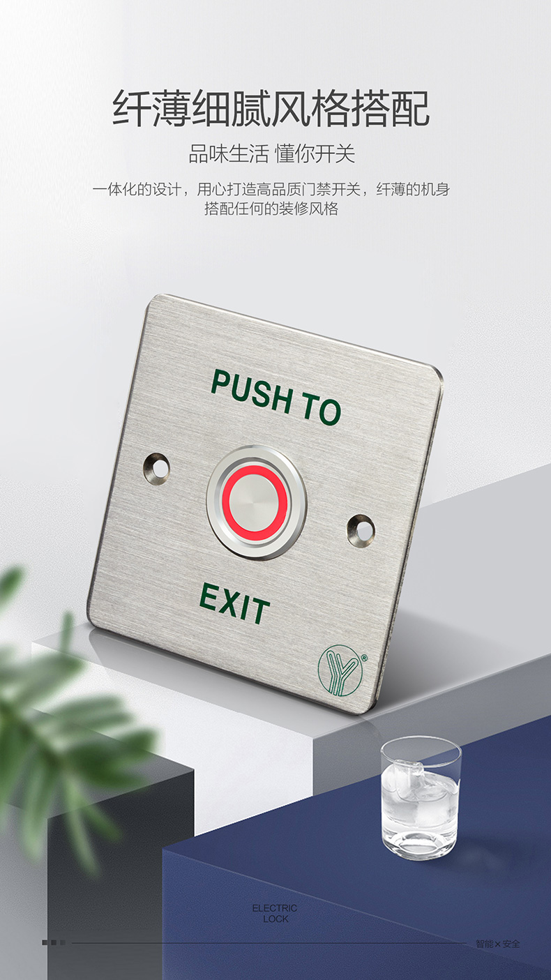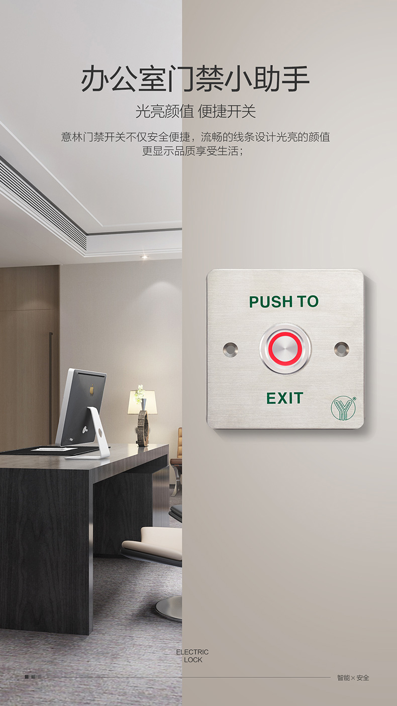 是門禁系統中最常見以及最常被使用到的,出門開關通常用于一般公家機關、銀行、大型、中小型企業以及百貨公司和住宅,外出開關系列有紅外線、觸控式、按鈕式、外出推把等。