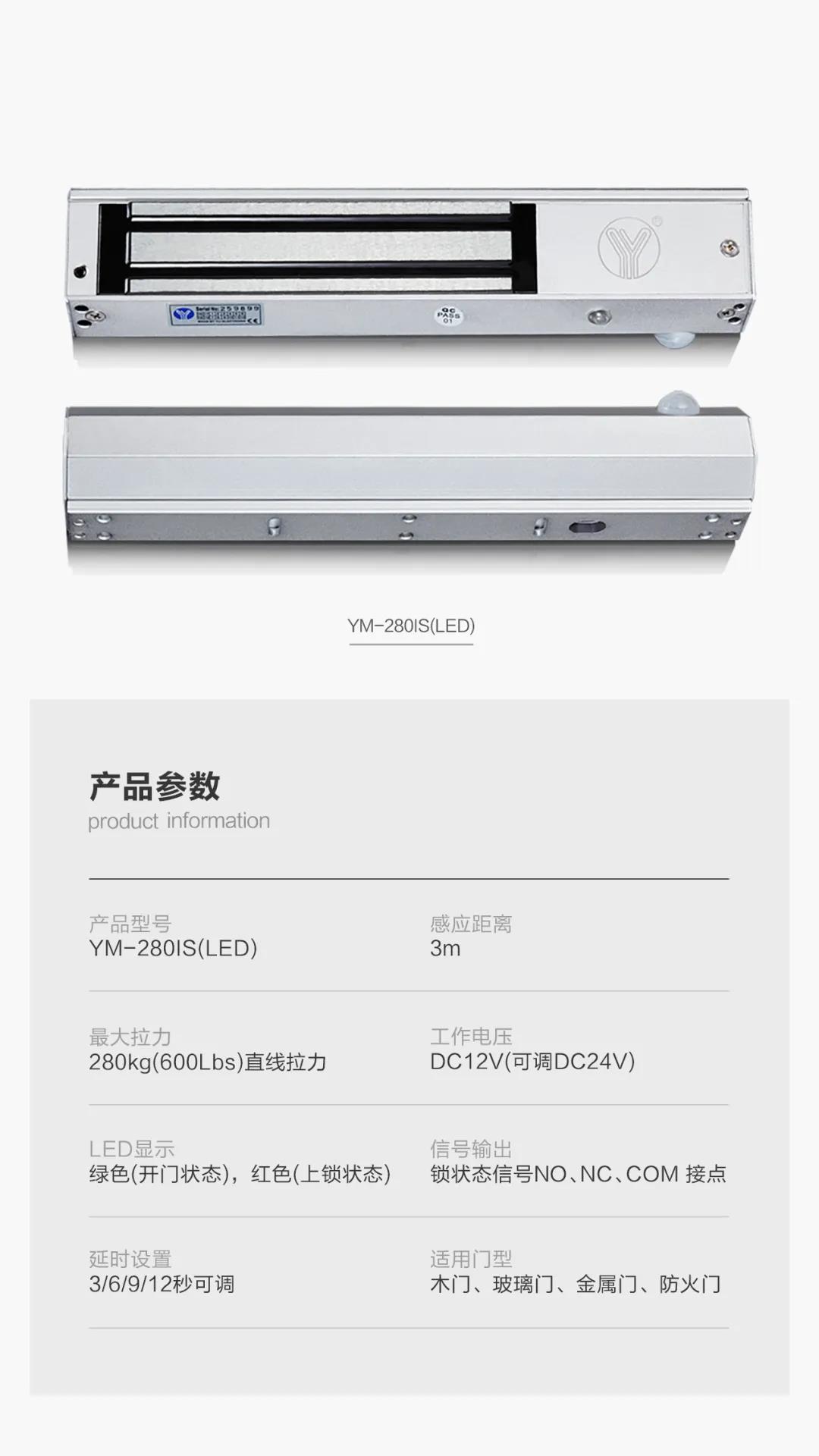 YM-280IS(LED)磁力鎖是本公司專利型設計的專業產品,紅外線感應距離3米,廣角130度,DC12V或DC24V雙電壓設計,NO、NC、COM鎖信號接點,高亮度LED顯示鎖狀態,3、6、9、12秒上鎖延時設計。本產品已申請專利保護,仿冒必究!