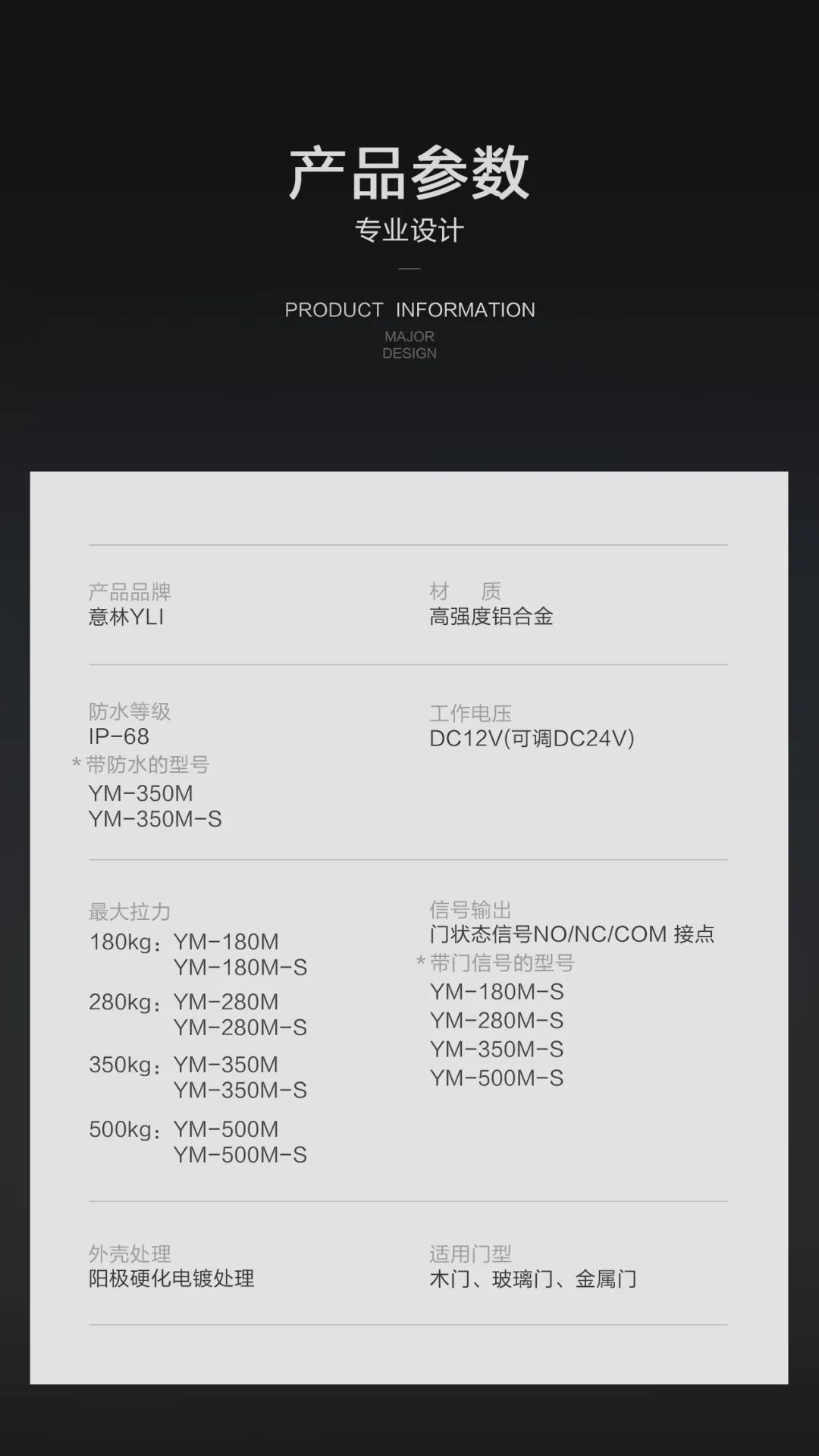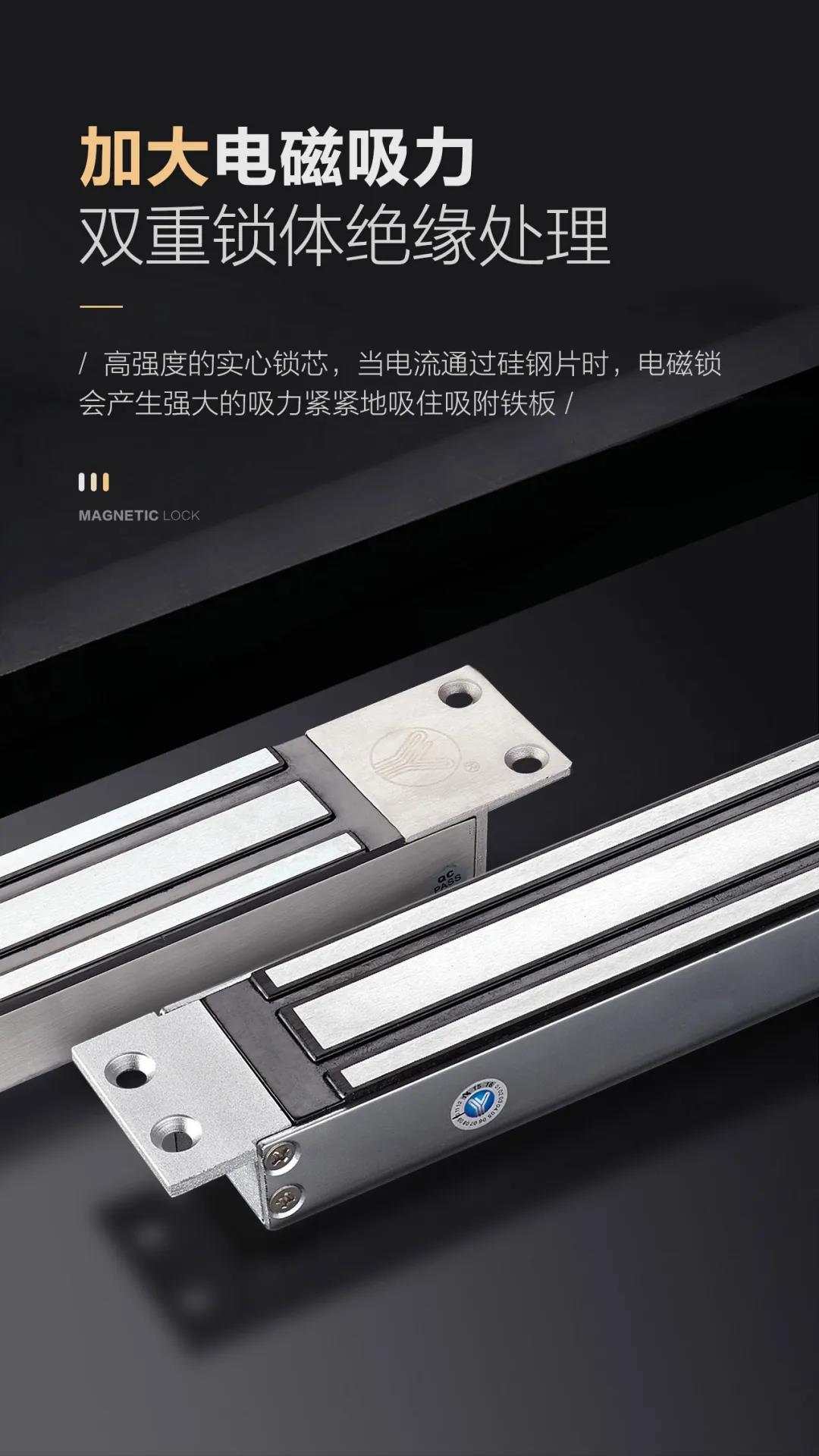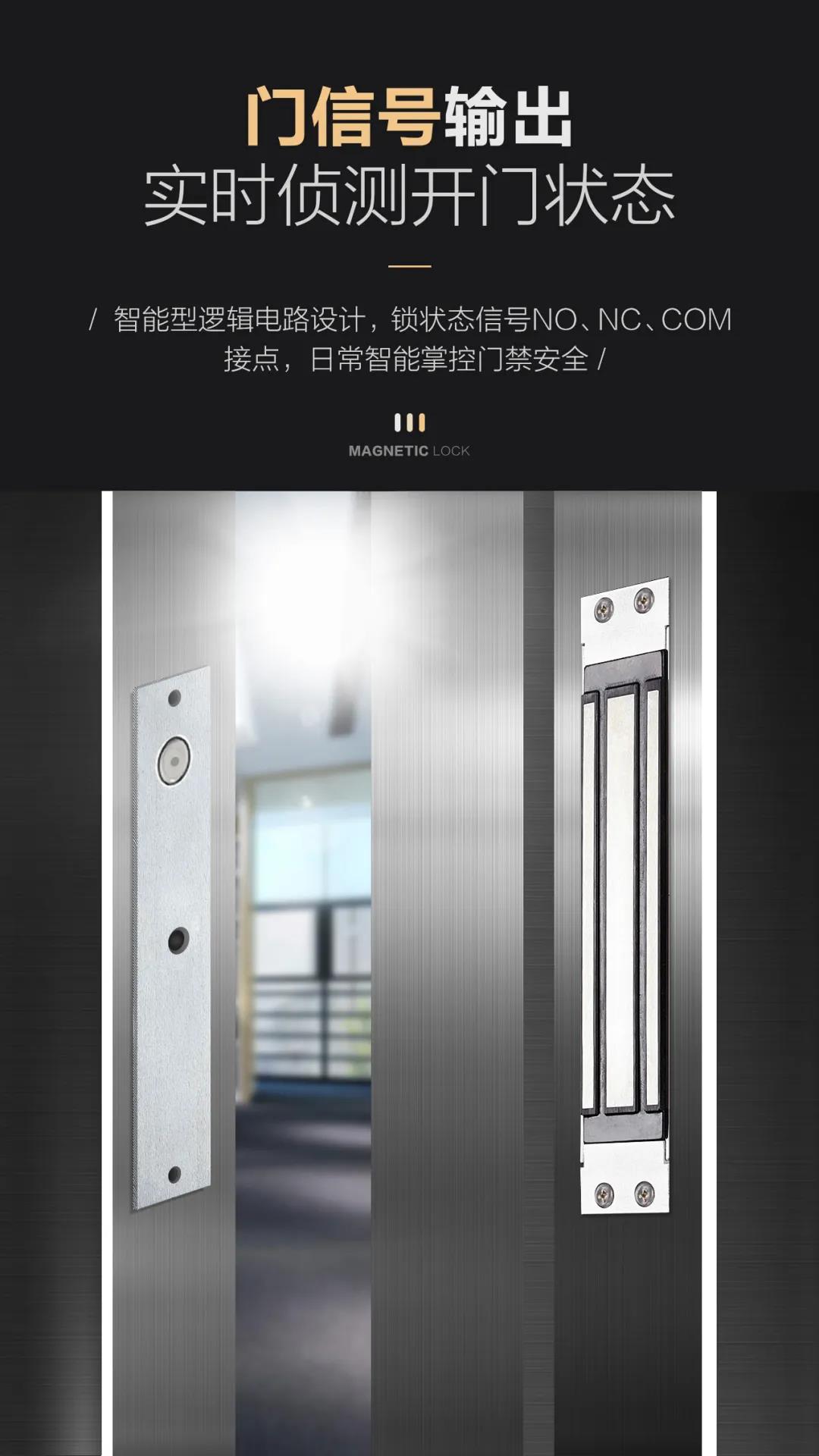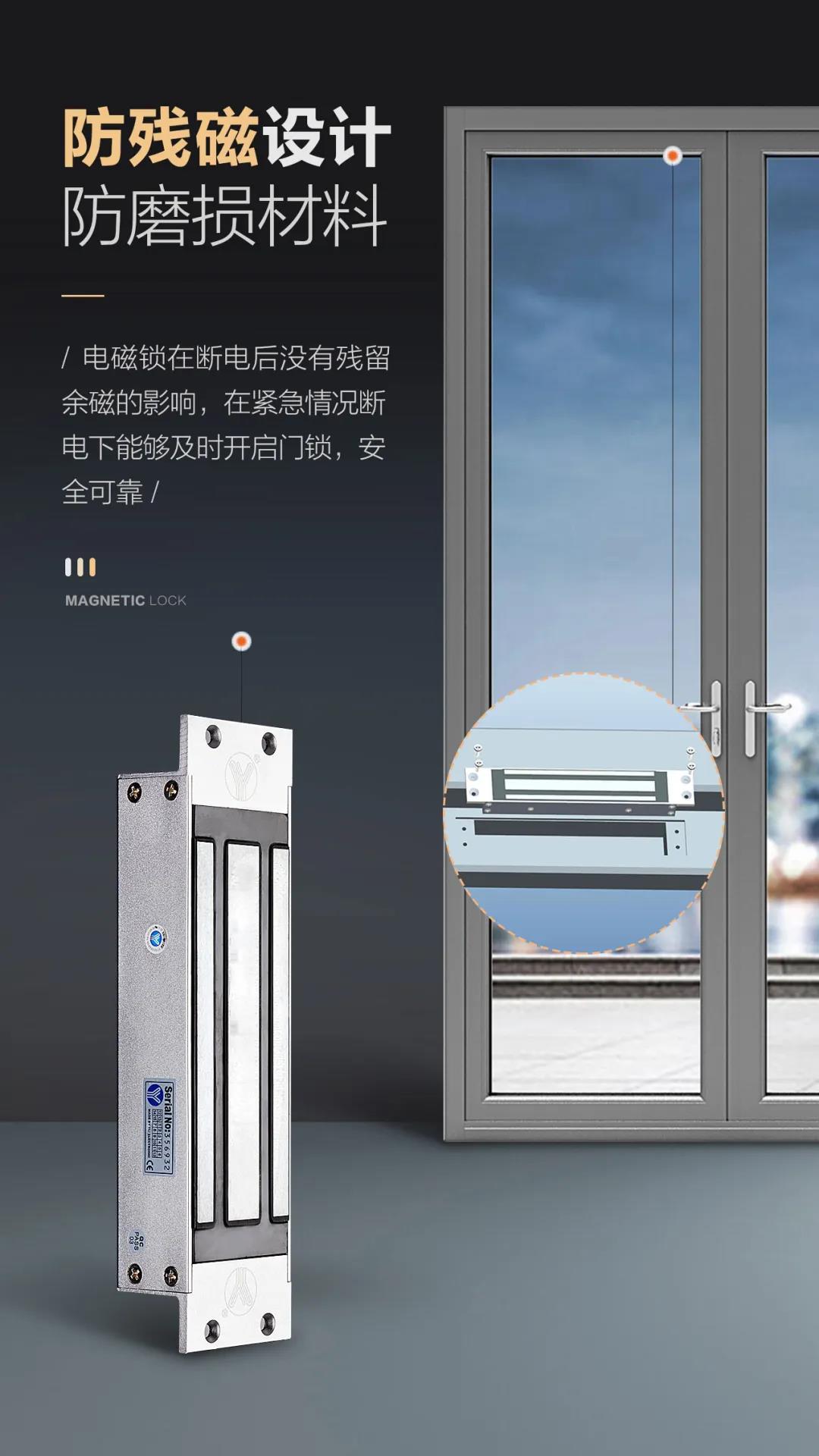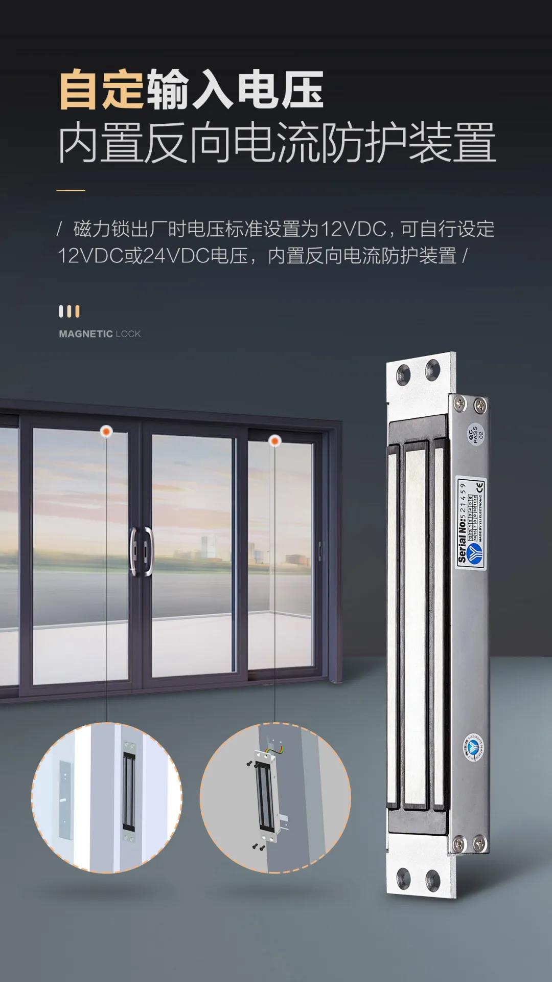 是針對一般金屬門、木門、防火門設計的,磁力鎖固定于門框上方,以磁力來吸附門扇,安全可靠。安裝時省時省力。內開式門或無框玻璃門、窄框等均有附件配套,特殊防殘磁設計,讓門禁自動化更安全。