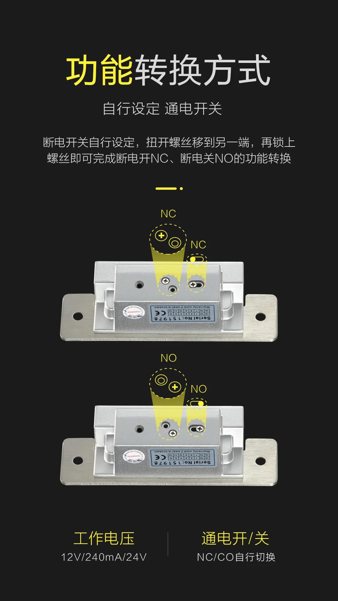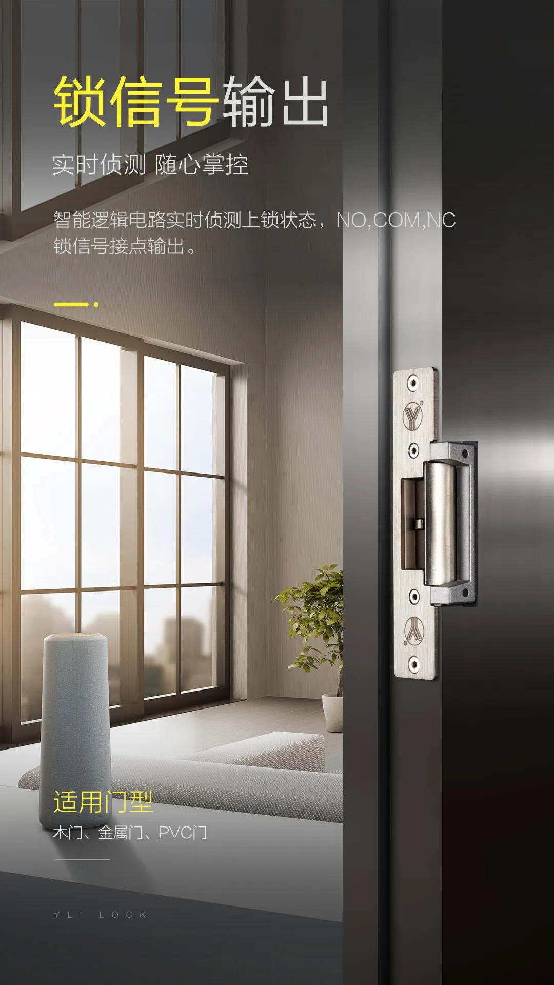 本公司產品配套齊全,內有一組門鎖狀態信號輸出干接點(NO/NC/COM),作為遠端監控門鎖是否上鎖狀態。電鎖口用電磁產生的推動或拉動釋放桿產生的工作原理上鎖或開鎖,總稱電鎖通常都是用電磁產生的電磁力工作。電鎖口兩種工作方式:分別是斷電上鎖型,即在沒通電的情況下,鎖舌打不開,反之通電開鎖;斷電開鎖型,即在通電的情況下,鎖舌可以打開,反之通電上鎖。