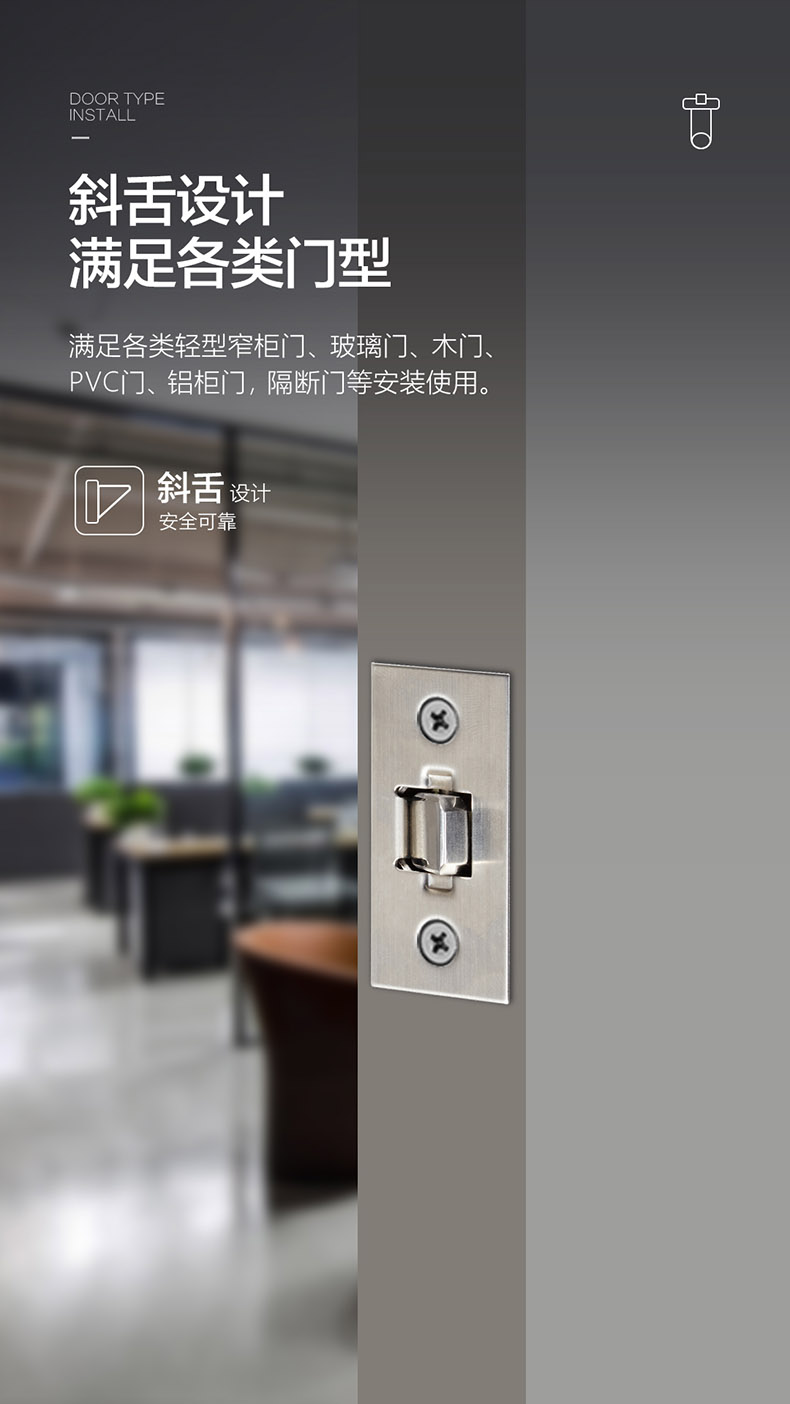 ,便于現(xiàn)場開孔安裝,斜舌設(shè)計可滿足各類輕型窄柜門、玻璃門、木門、PVC門、鋁柜門,隔斷門等安裝使用。