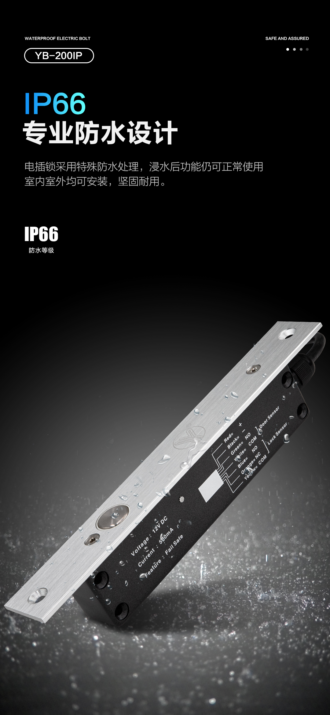 YB-200IP防水電插鎖,經過精心設計和制造,具有優異的防水性能,防水等級達到IP66,即使在潮濕的環境中也能保持穩定和安全。鎖舌采用整體式304不銹鋼實心棒材,經CNC車床精加工而成,工藝精湛,最高可承受800kg沖擊。門/鎖狀態信號輸出,實時偵測門鎖狀態反饋。專業設計的耐用型電磁閥,使用壽命超過50萬次測試合格。