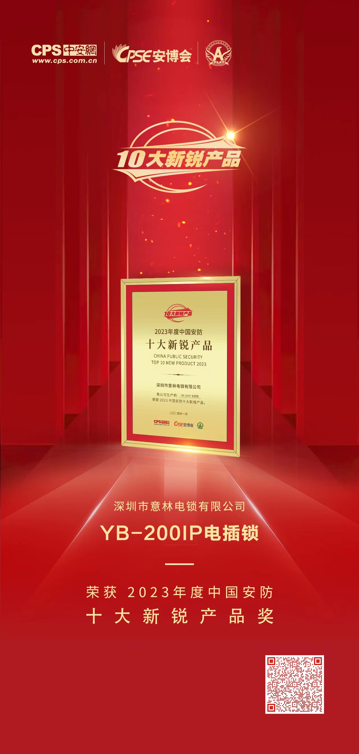 意林電子YB-200IP防水電插鎖憑借實力斬獲“2023 年度中國安防十大新銳產品”
