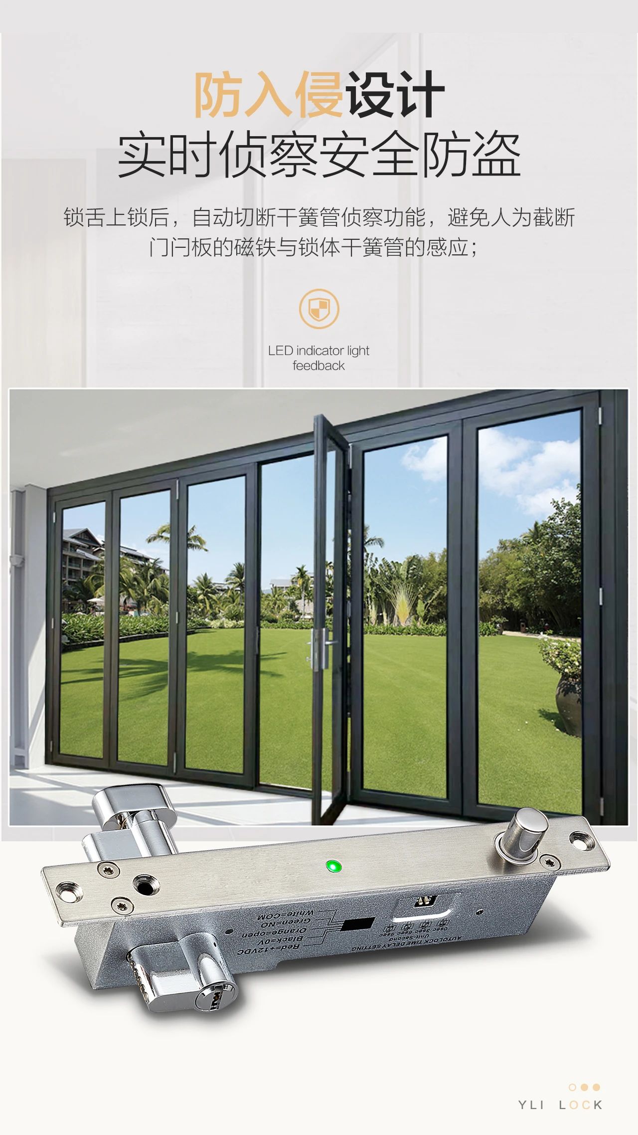 電插鎖:電插鎖通常需要安裝在門框上,并與門鎖槽相匹配。在門關閉時,鎖舌會插入門鎖槽,從而鎖住門。