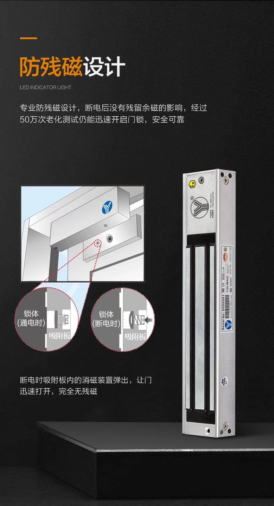 兩種材質(zhì),結(jié)構(gòu)簡單、無磨損、便于安裝維修,發(fā)生危險時斷電解鎖便于逃生,可靠性高。