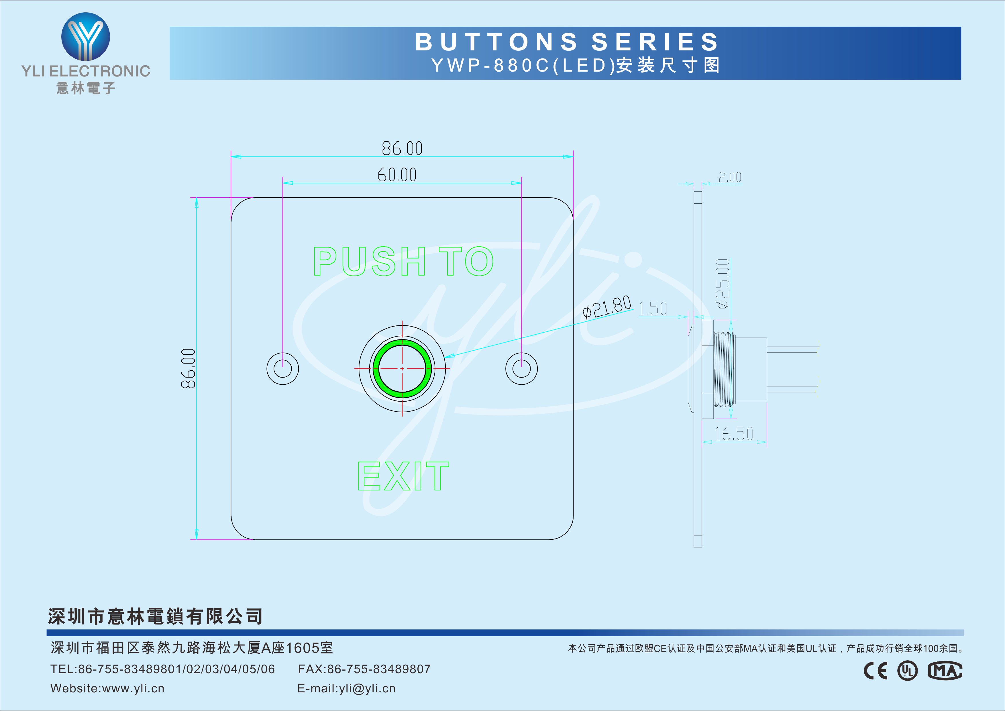 YWP-880C(LED)是一款防水型按壓式門禁專用開關,防雨水設計,LED燈顯示:通電亮燈,常亮綠色。面板304不銹鋼拉絲工藝處理,金屬材質按鈕,經CNC車床加工后拋光而成,10萬次耐用測試合格,堅固耐用,產品美觀。門禁系統配套的最佳選擇。