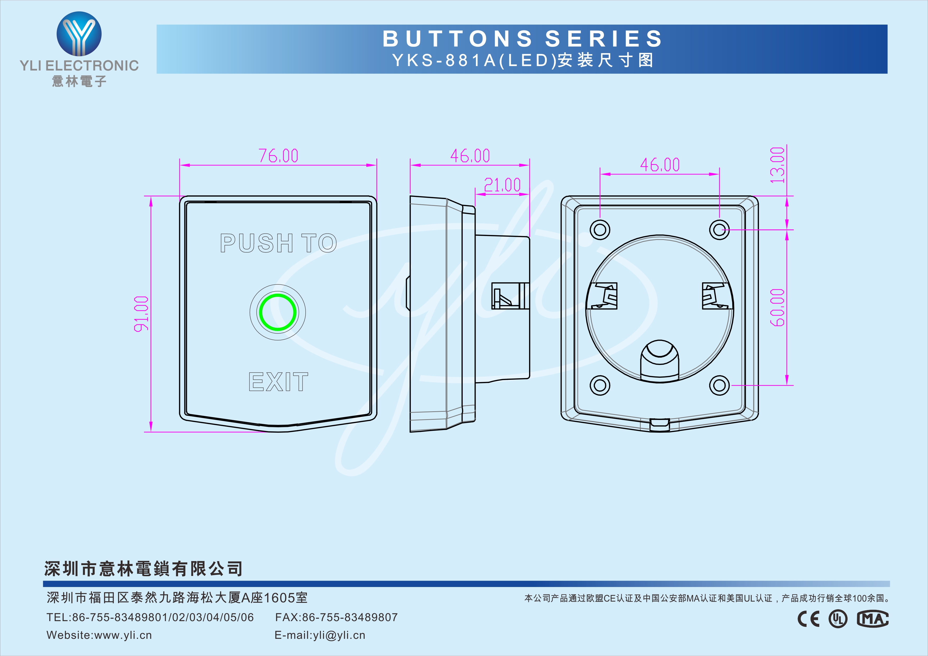 YWP-881A(LED)是一款暗裝防水型按壓式門禁專用開關,LED燈顯示:通電亮燈,常亮綠色。產品采用鋅合金面板,金屬按鈕,防雨水,防拆設計,堅固耐用。10萬次耐用測試合格,堅固耐用,產品美觀。門禁系統配套的最佳選擇。