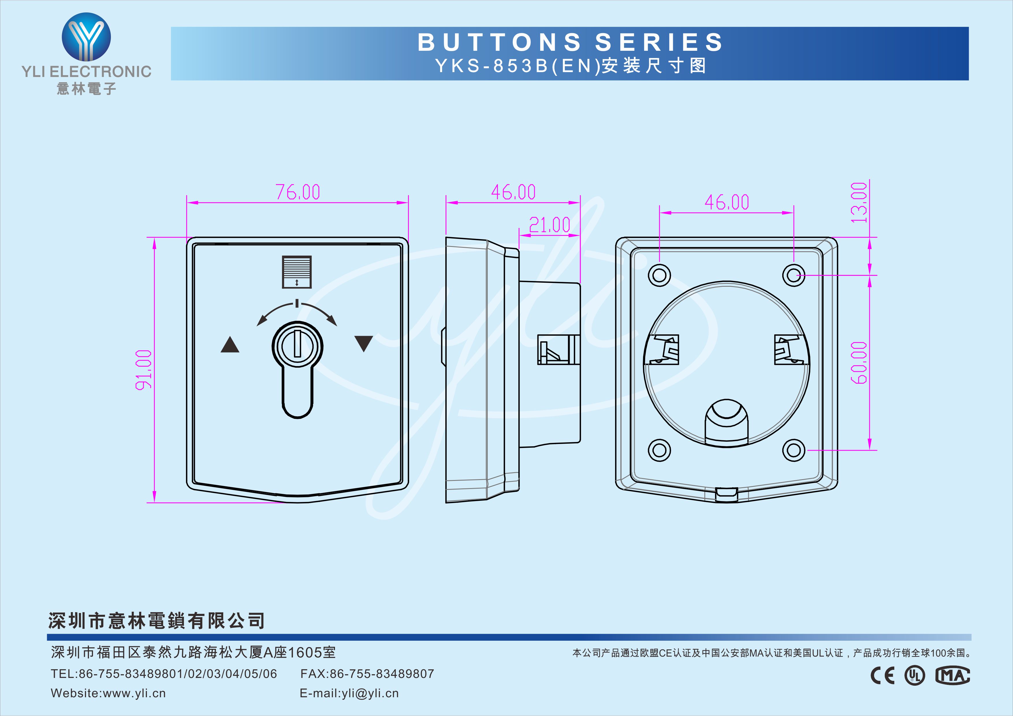YKS-853A(EN)是一款暗裝歐式卷簾門(電動門)開門匙掣開關,外殼采用全金屬結構,歐式匙掣采用黃銅鍍鉻工藝,耐用型開關,防雨水,防拆設計,十分堅固耐用。卷簾門開門匙掣開關安裝在室外,串聯或并聯在電源供應器與卷簾門(電動門)電機之間,當遙控開門設備故障時使用開門匙掣開門及開門匙掣鎖匙只授權給管理人員使用,是商業展廳,零售店,倉庫,工廠,車庫,卷簾門(電動門),指定配套設備。