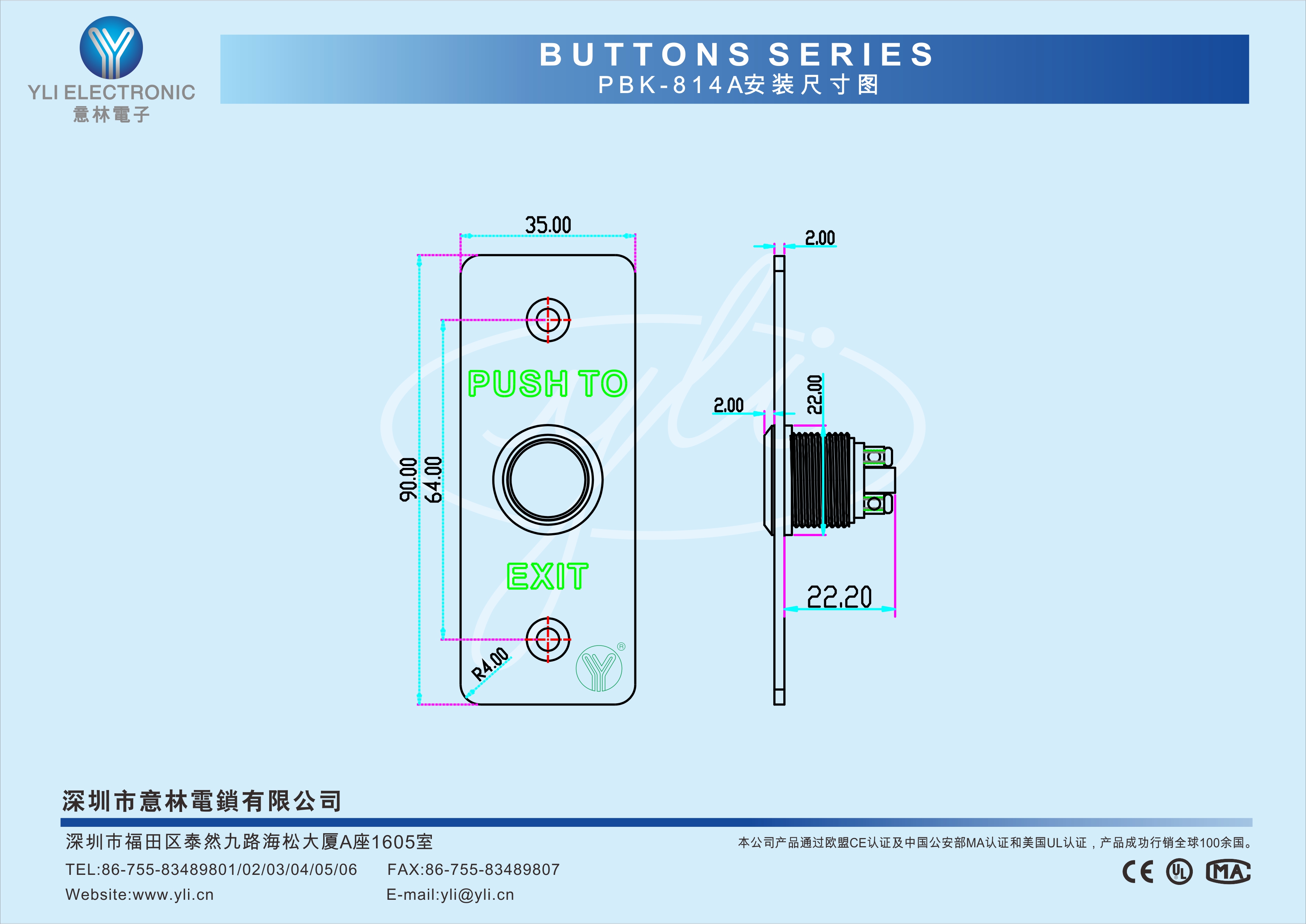 PBK-814A是一款耐用型按壓式不銹鋼門禁專用開關,面板選用304不銹鋼拉絲工藝,按鈕選用銅鍍鉻,經CNC車床加工后拋光而成,五十萬次老化測試合格,產品美觀、耐用,是門禁系統配套的最佳選擇。