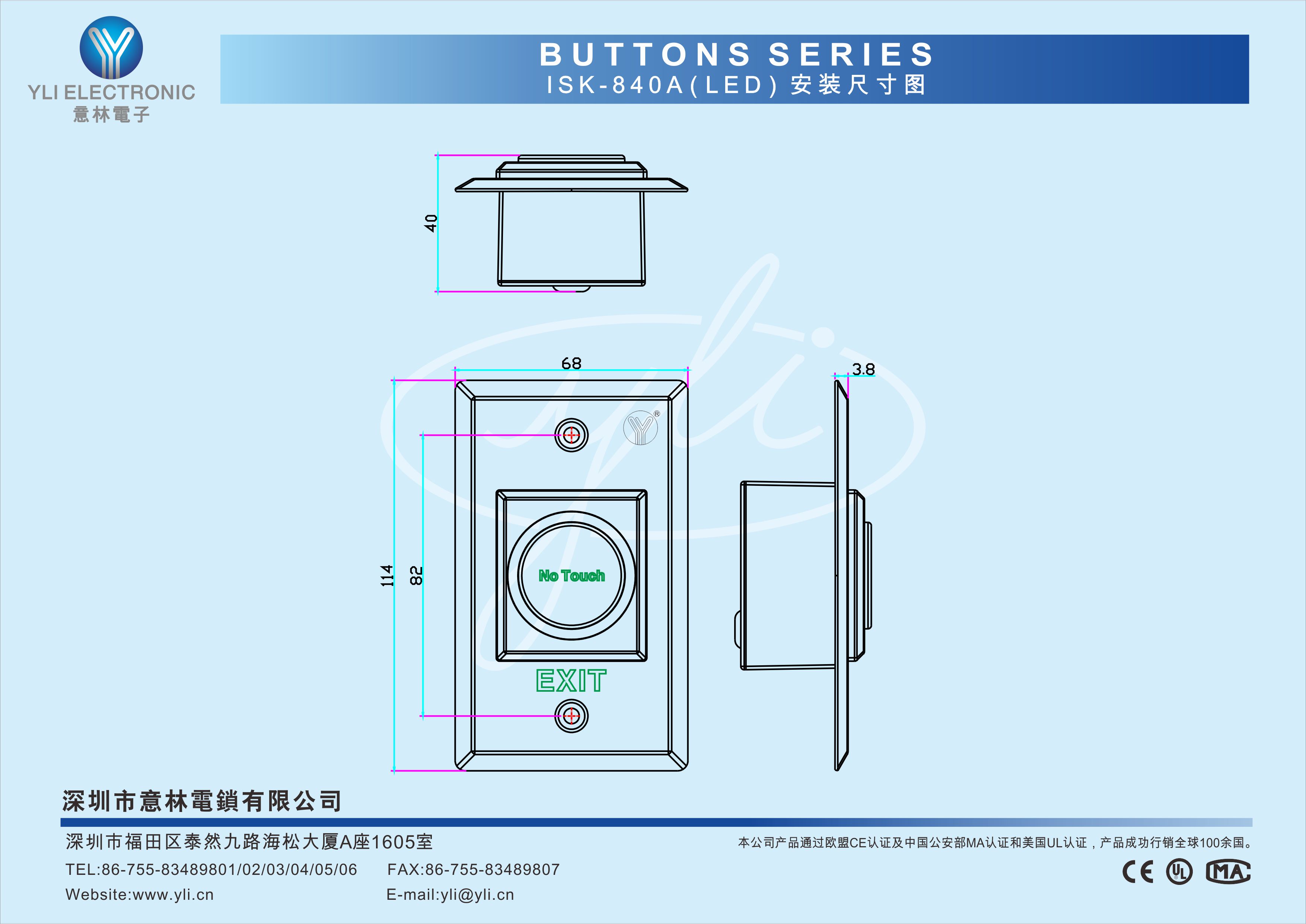 ISK-840A(LED) 是一款紅外感應(yīng)門禁開關(guān), 采用304不銹鋼拉絲處理,耐磨抗沖擊,堅(jiān)固耐用。感應(yīng)距離0.1-10cm可調(diào)。LED燈顯示: 藍(lán)色為待機(jī)狀態(tài),紅色為開門狀態(tài)。適用于智能樓宇、住宅小區(qū)、辦公樓、酒店、醫(yī)院、體育館等場所使用。