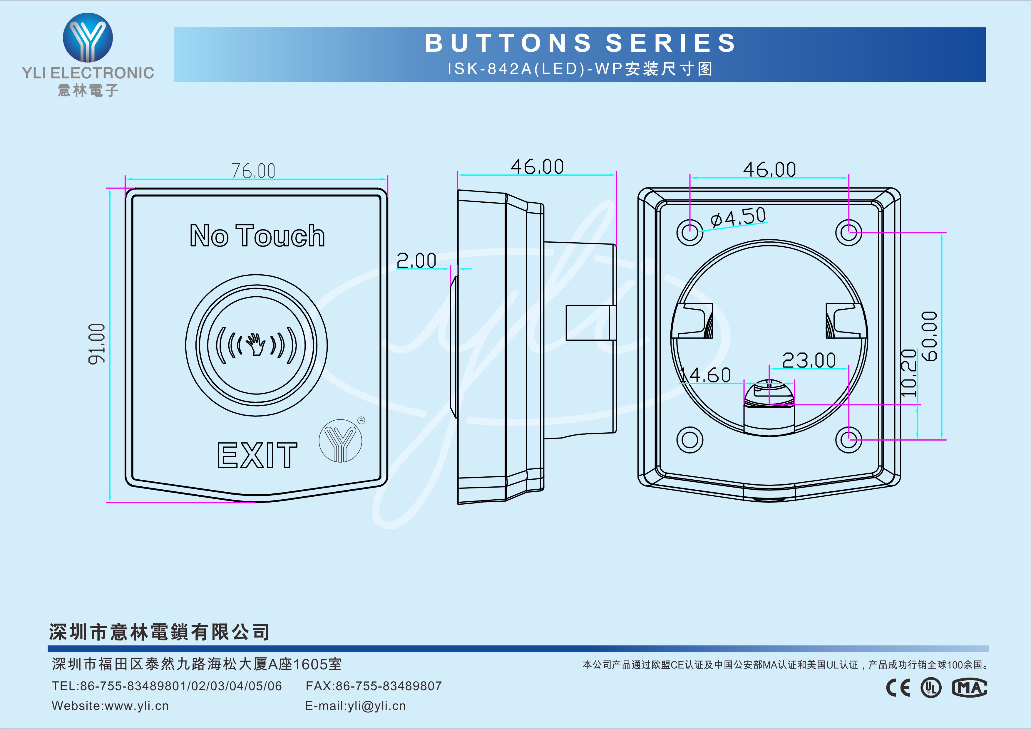 ISK-842A(LED)-WP 是一款暗裝防水型紅外感應門禁開關, 采用全金屬結構,金屬按鈕。具有延時可調功能及感應功能,最大感應距離10cm。LED燈顯示: 紅色待機狀態; 綠色動作狀態。 防雨水、防拆設計,堅固耐用。適用于智能樓宇、住宅小區、辦公樓、酒店、醫院、體育館等場所使用。