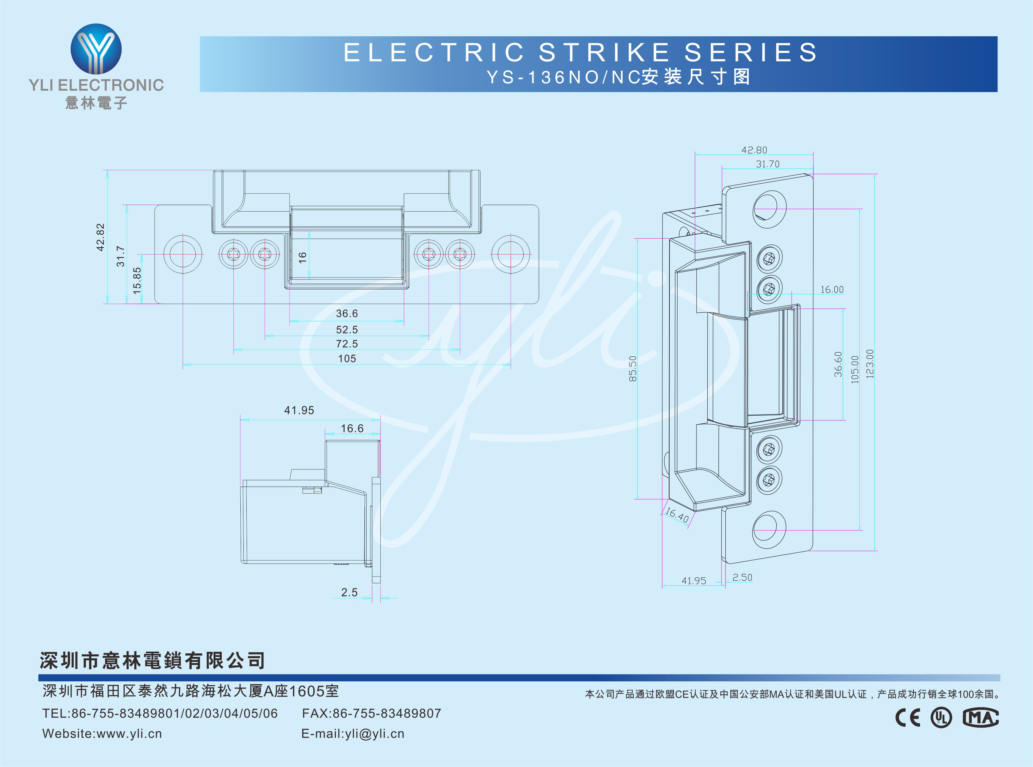 YS-136NO/NC 美規堅固型電鎖口,是專為美規機械鎖配套應用而設計,適用于一般木門、金屬門、PVC門等。可以達到平時“電控”與緊急時“手動”開門雙功能,本型號電鎖口采用加強型連續工作耐用電磁閥,(連續通電測試100萬次合格),(NO,斷電上鎖)及(NC,斷電開鎖)可選擇,鎖舌采用304不銹鋼材質,內連動部件采用304不銹鋼加強處理,(靜態拉力約900K),更堅固,更耐用。