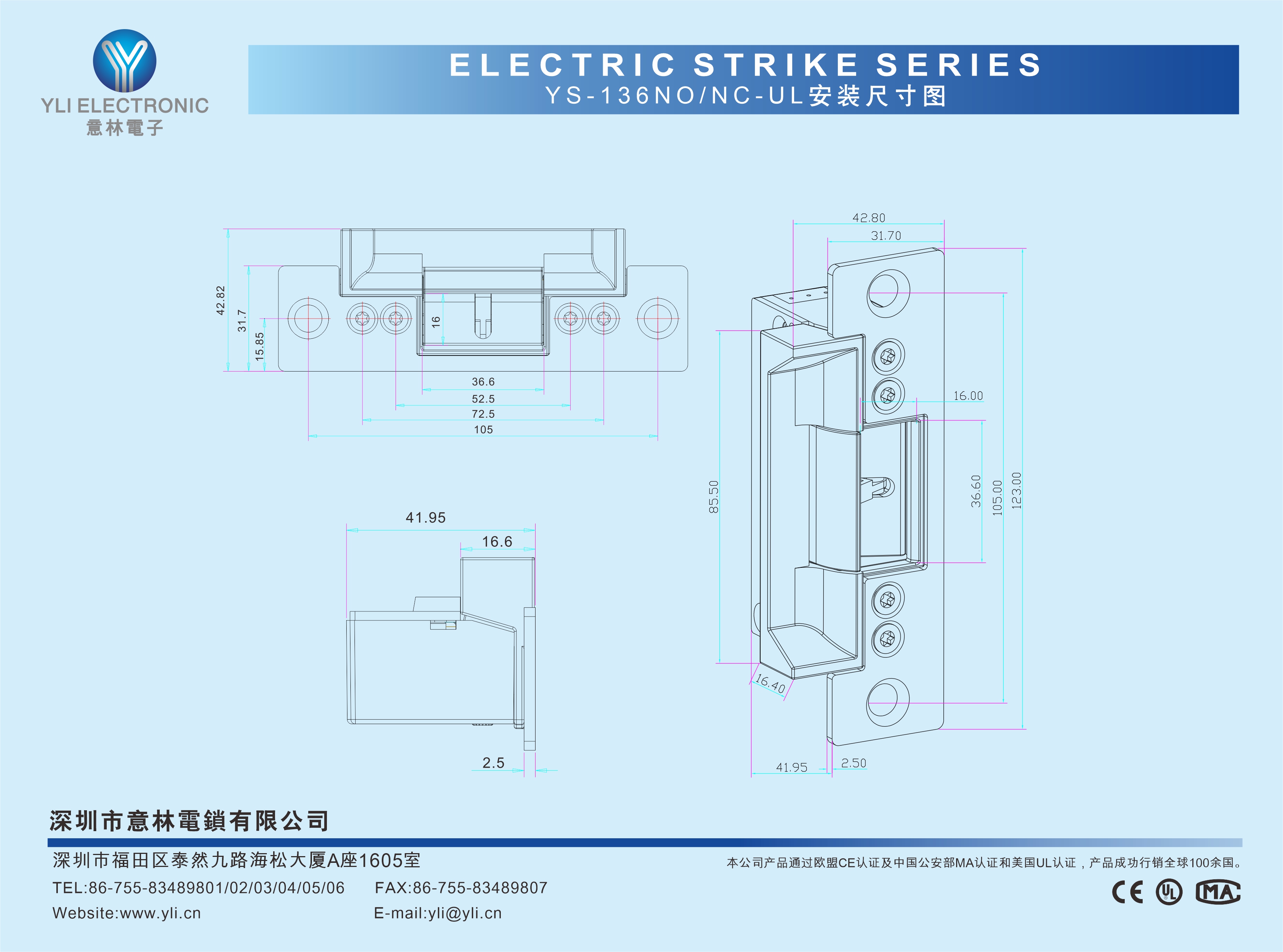 YS-136NO/NC-UL 美規(guī)堅(jiān)固型電鎖口,是專為美規(guī)機(jī)械鎖配套應(yīng)用而設(shè)計(jì),適用于一般木門、金屬門、PVC門等??梢赃_(dá)到平時(shí)“電控”與緊急時(shí)“手動(dòng)”開門雙功能,本型號(hào)電鎖口采用加強(qiáng)型連續(xù)工作耐用電磁閥,(連續(xù)通電測(cè)試100萬次合格),(NO,斷電上鎖)及(NC,斷電開鎖)可選擇,鎖舌采用304不銹鋼材質(zhì),內(nèi)連動(dòng)部件采用304不銹鋼加強(qiáng)處理.