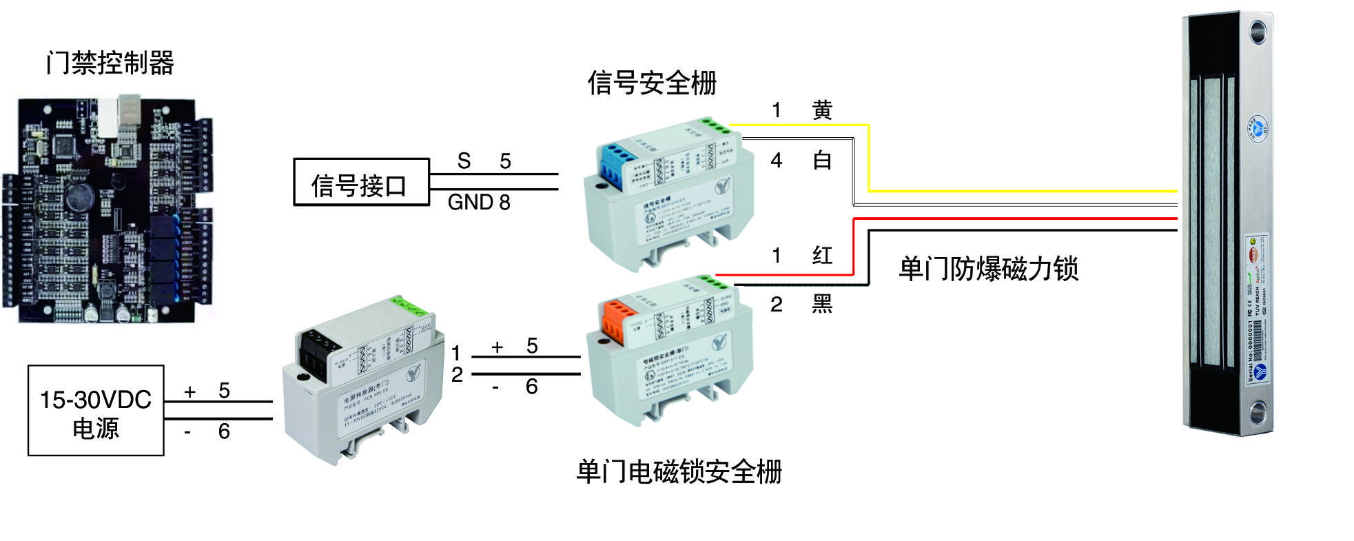 電源轉換器能將15~30VDC電源輸入轉換成12VDC輸出,供電磁鎖安全柵和防爆電磁鎖配套使用,防爆電磁鎖電源安全柵安裝在安全區或防爆箱內,連接危險區的防爆電磁鎖。