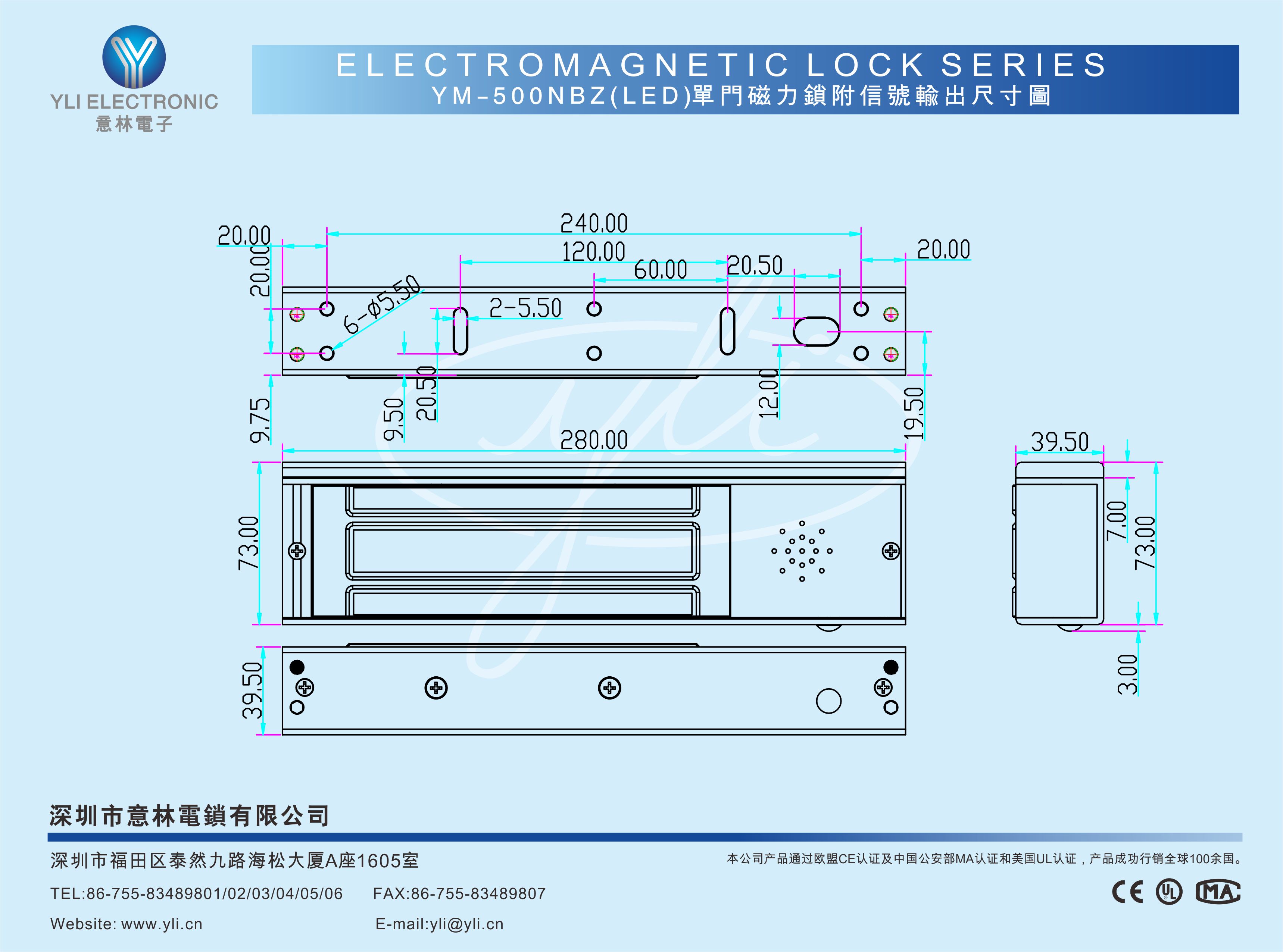 YM-500NBZ(LED)單門磁力鎖附蜂鳴報警器是針對木門、金屬門、玻璃門、防火門等設(shè)計的。內(nèi)置一組逾時關(guān)門蜂鳴警報器,當(dāng)門鎖超過設(shè)定時間(0-20秒)未關(guān)時,內(nèi)部的蜂鳴警報器即報警,直到門關(guān)閉為止。另設(shè)有一組鎖狀態(tài)信號(NO/NC/COM)輸出接點,為門禁系統(tǒng)實時反饋信息,鎖體設(shè)有加大LED燈顯示,綠燈開鎖,紅燈上鎖。意林磁力鎖加大電磁吸力設(shè)計,吸力超強,鎖芯特殊加強焊接工藝,抗撞擊力及抗扭力比常規(guī)生產(chǎn)工藝強2-3倍,更堅固耐用。表面處理采用國際領(lǐng)先的電鍍工藝,通過國家實驗室240小時鹽霧測試,達到防氧化、防銹、防腐性能。適用于日常辦公場所或沿海鹽霧,潮濕(如:地鐵,機場,核電站,跨海大橋,港口碼頭,醫(yī)療機構(gòu),沿海城市建筑)等場景使用。本公司產(chǎn)品規(guī)格及配套齊全,內(nèi)開式門或無框玻璃門、窄框門等均有安裝支架配套,有效滿足現(xiàn)代智能建筑的各種場景需求。