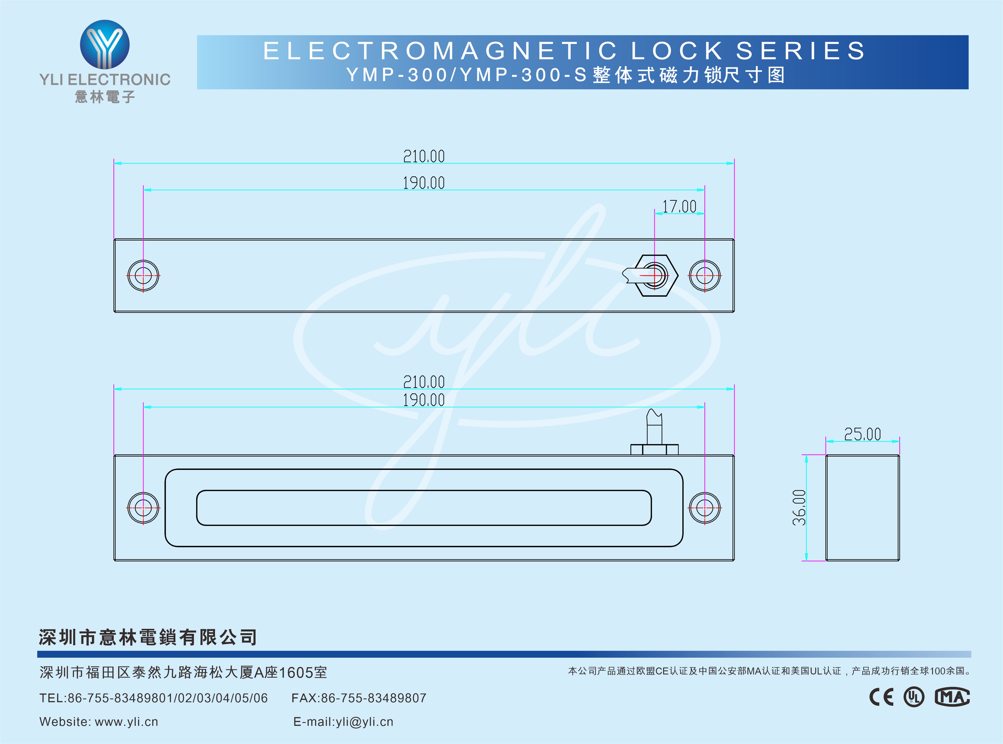 YMP-300-S是一款整體式結構的單門磁力鎖附鎖信號輸出,鎖體采用整體式電磁專用型材經特制設備精工而成,抗撞擊力及抗扭力更強,更堅固耐用。內設有一組鎖狀態信號(NO/COM)輸出接點,為門禁系統實時反饋信息。意林磁力鎖加大電磁吸力設計吸力超強,表面處理采用國際領先的電鍍工藝,通過國家實驗室240小時鹽霧測試,達到防氧化、防銹、防腐性能。產品廣泛應用于日常辦公場景或沿海鹽霧.潮濕(如:地鐵,機場,核電站,跨海大橋,港口碼頭,醫療機構,沿海城市建筑)等場景使用。本公司產品規格及配套齊全,內開式門或無框玻璃門、窄框門等均有安裝支架配套,有效滿足現代智能建筑的各種場景需求。