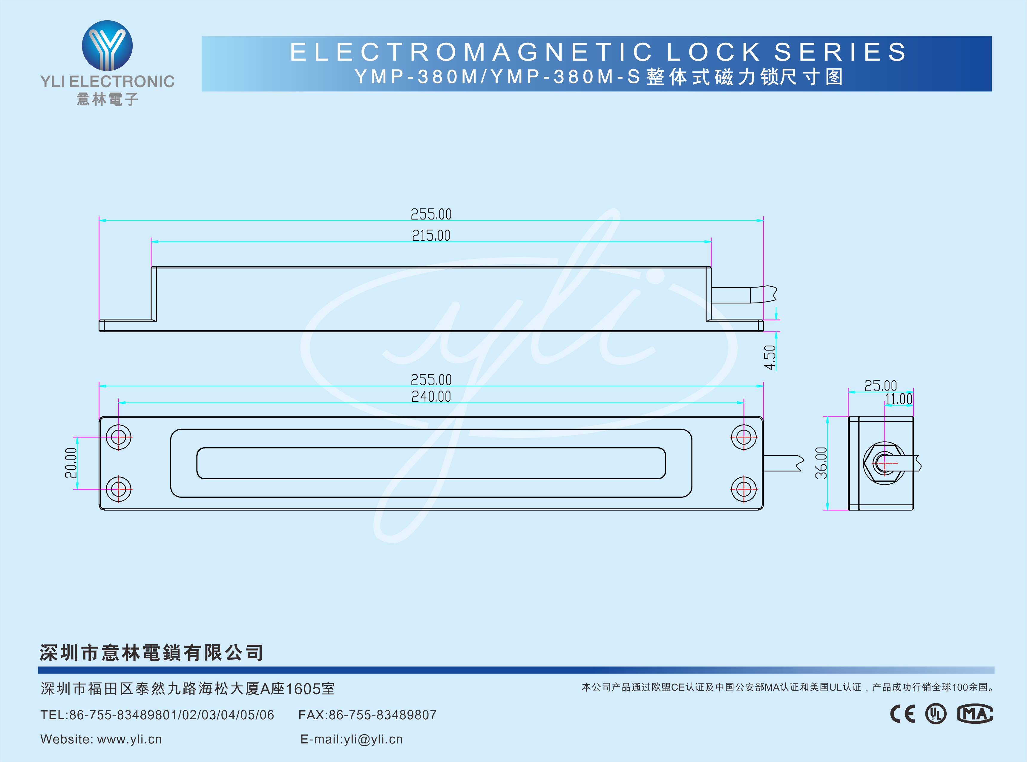 YMP-380M-S 是一款整體式結構暗裝式單門磁力鎖附鎖信號輸出,鎖體采用整體式電磁專用型材經特制設備精工而成,抗撞擊力及抗扭力更強,更堅固耐用。內設有一組鎖狀態信號(NO/COM)輸出接點,為門禁系統實時反饋信息。意林磁力鎖加大電磁吸力設計吸力超強,表面處理采用國際領先的電鍍工藝,通過國家實驗室240小時鹽霧測試,達到防氧化、防銹、防腐性能。產品廣泛應用于日常辦公場景或沿海鹽霧.潮濕(如:地鐵,機場,核電站,跨海大橋,港口碼頭,醫療機構,沿海城市建筑)等場景使用。本公司產品規格及配套齊全,內開式門或無框玻璃門、窄框門等均有安裝支架配套,有效滿足現代智能建筑的各種場景需求。